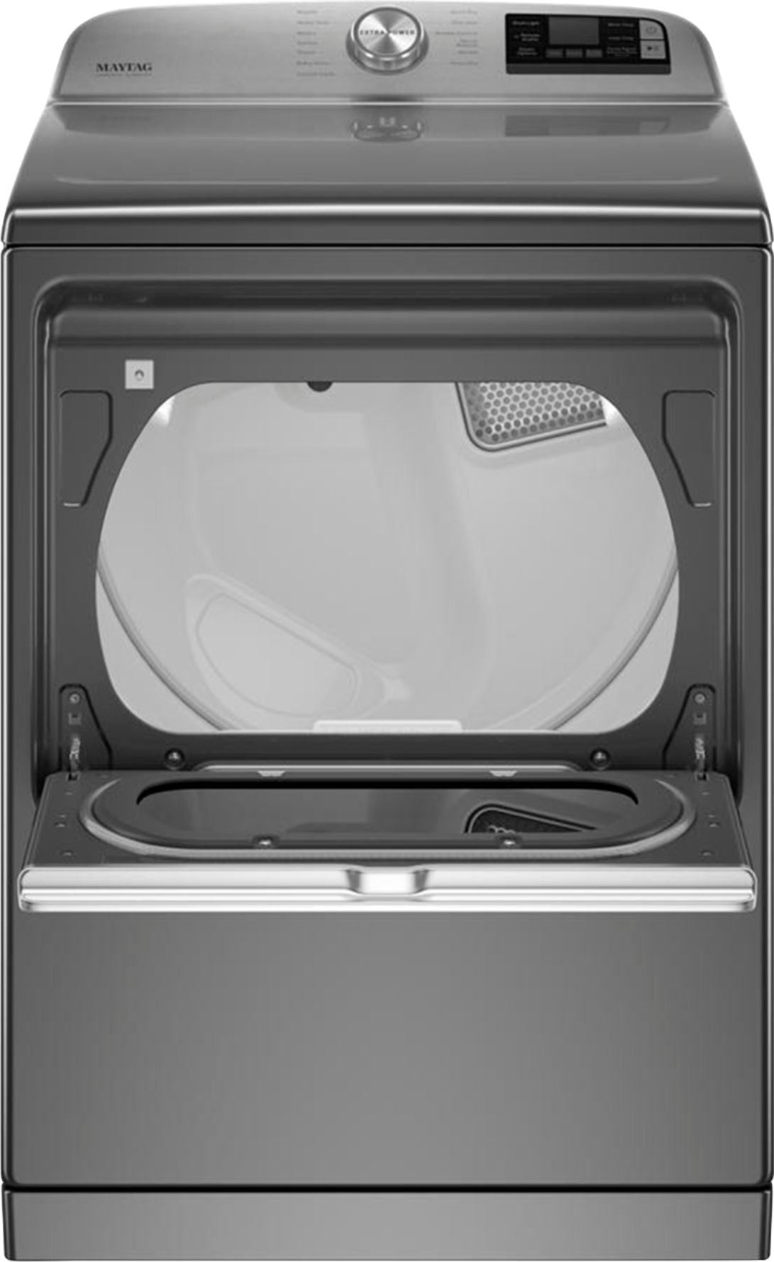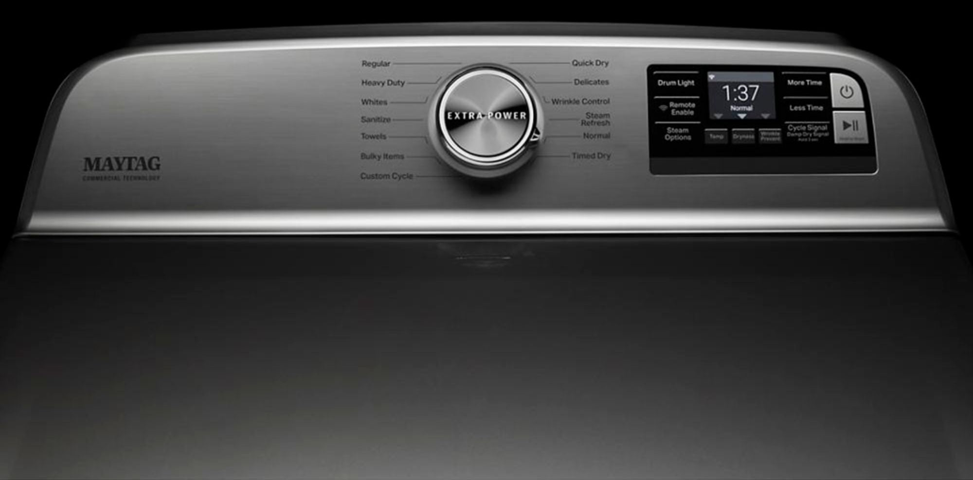 One push of the Extra Power button on Maytag heavy-duty dryers boosts drying power on any cycle by extending time heat and tumbling. Commercial-grade dryer technology ensures it's built to last while optional smart electric dryer features such as remote start and cycle notifications help you stay in control and efficiently manage laundry from anywhere.