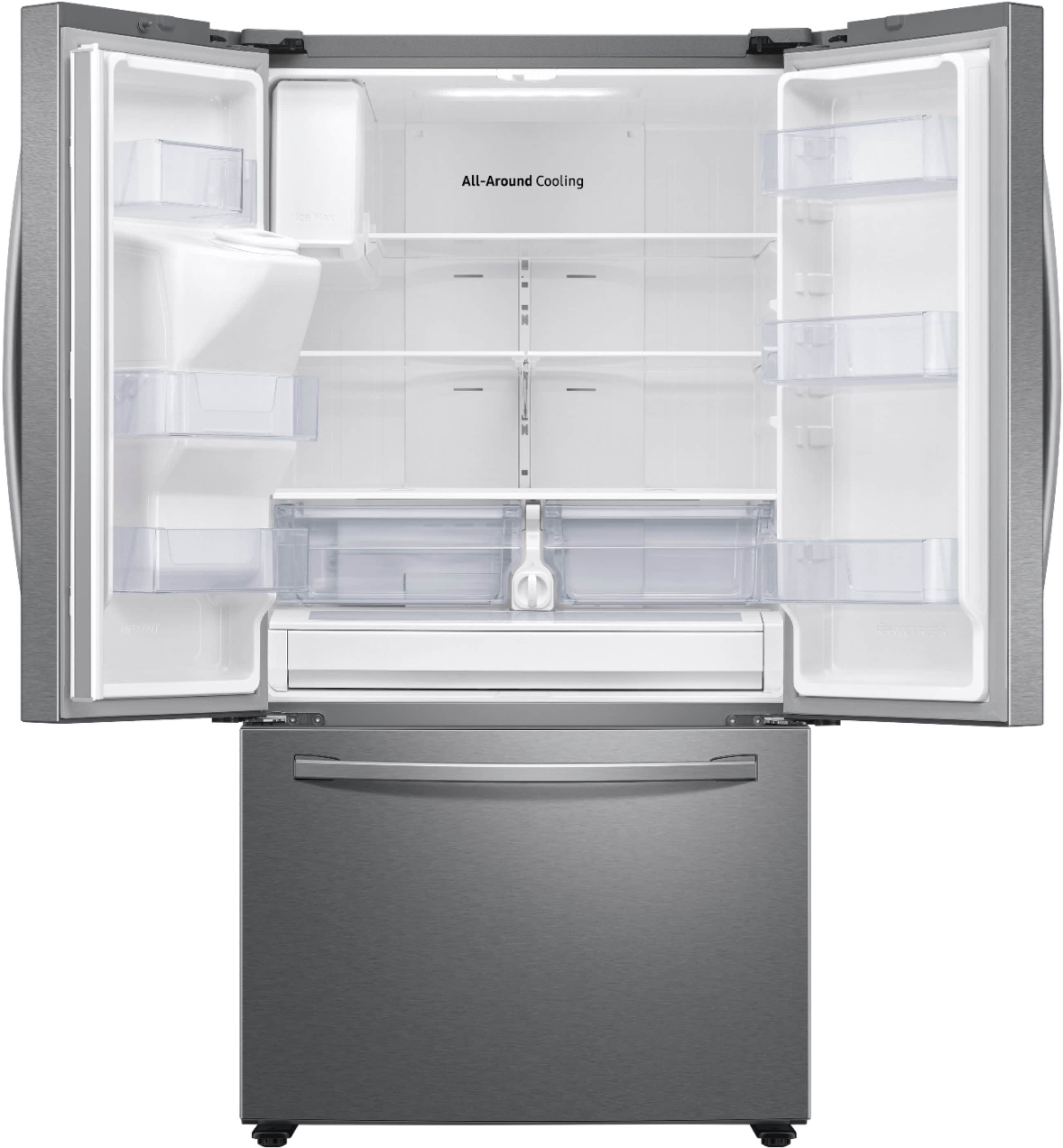 Samsung's 27 cu. ft. large capacity 3-door French door refrigerator is beautifully designed with a minimal dispenser sleek-edge doors and modern handles. The clean lines and modern form blend beautifully into your kitchen while the fingerprint-resistant finish withstands everyday smudges.