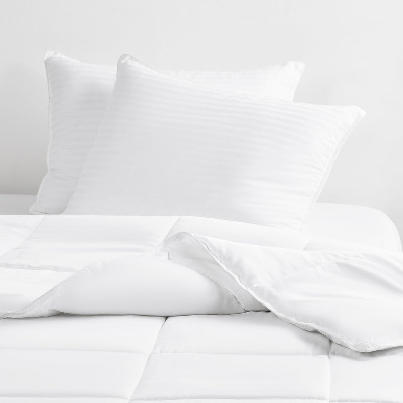 FEATURES:• 2 Pillows per set• 240TC breathable cotton cover• Soft blend of luxury gel-infused fibers prevents heat from being trapped leaving you with a cool and comfortable sleep• Clean cooling gel-fibers are non-toxic, odorless, conforming and provides a healthy alternative to the chemicals, odors of memory foam which can cause irritations such as headaches and pain from lumpiness• Perfect firmness that balances between soft comfort and stable support• Safe for even the most sensitive users and provides comfort for those who suffer from asthma, allergies, and other sensitive skin conditions• Comforting support for all types of sleepers: back, side, and stomach with our soft down-like fibers• With their no-shift construction, these pillows are a fantastic place to rest your head• Pillows are fade and stain resistant• Machine washable and dryer safe