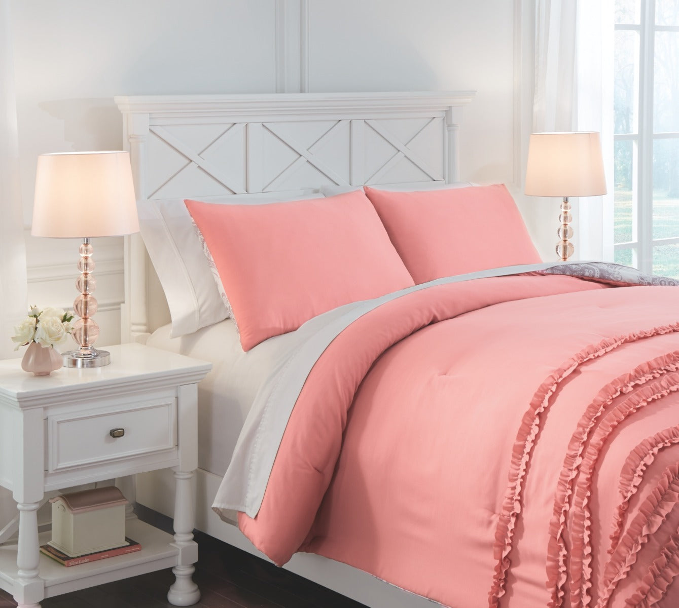 Loaded with high-style twists and turns, this comforter set is the essence of fresh, fun, youthful style. Solid pink with ruffle stripe detail that reverses to a mandala and lotus design in pink, white and gray. Perfect for your tween or teen's fashion sense.