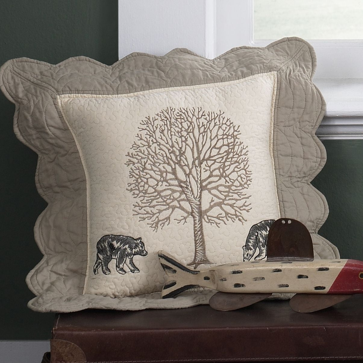 Elegantly quilted scalloped edges and embroidery shows high attention to detail in ths pillow. Black bears and a tree are embroidered onto soft ivory fabric, giving It a quite sophistication. Coordinates with the Bear Creek collection.