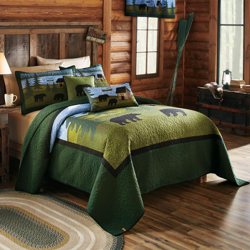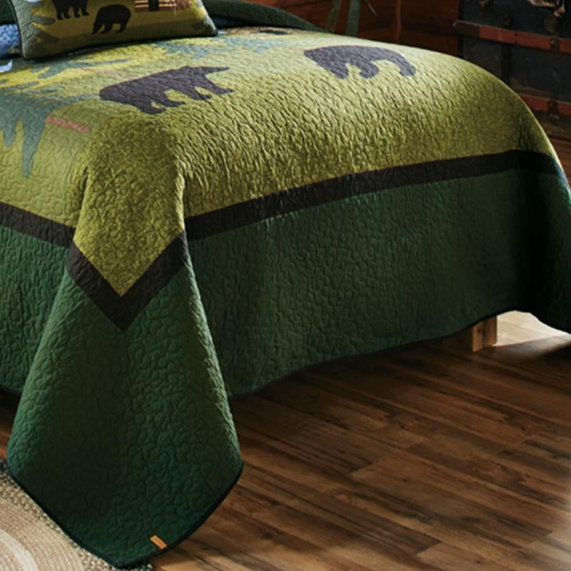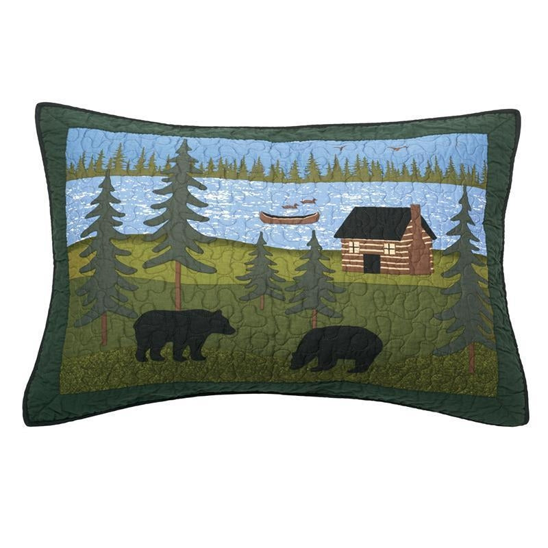 The 100% cotton lodge-inspired bedding collection honors the beauty of nature’s majestic black bear. This richly-colored quilt pattern features a little chestnut-brown cabin nestled by a shimmering blue lake, surrounded by tall, forest-green pine trees. Two black bears pay a visit in the mossy-green field while a little canoe and two brown ducks float peacefully in the distance. The pattern is framed in a rich, green border with black accents and crafted using dense, thick cotton for strength and durability. Take a trip to a mountain lake without ever leaving your front door with our new quilted Bear River bedding! Set includes matching shams. Prewashed to prevent shrinking. Pillows sold separately