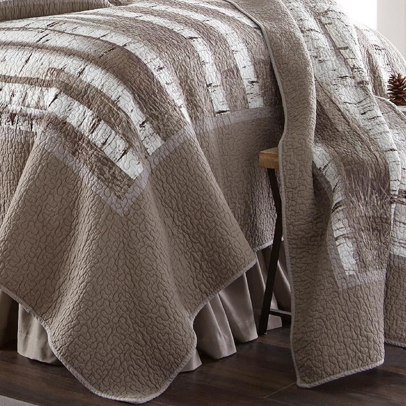 This striking and elegant, outdoor-inspired 100% cotton quilted bedding collection is based on the ever-popular white birch tree. Realistic trees are displayed in a forest scene with a gentle blue and yellow sky peeking through. Colors include smoke and ash grey, white, robin egg blue, buttercream and touches of charcoal crafted on dense, thick cotton for strength and durability. Set includes matching shams. Prewashed to prevent shrinking. Pillows sold separately