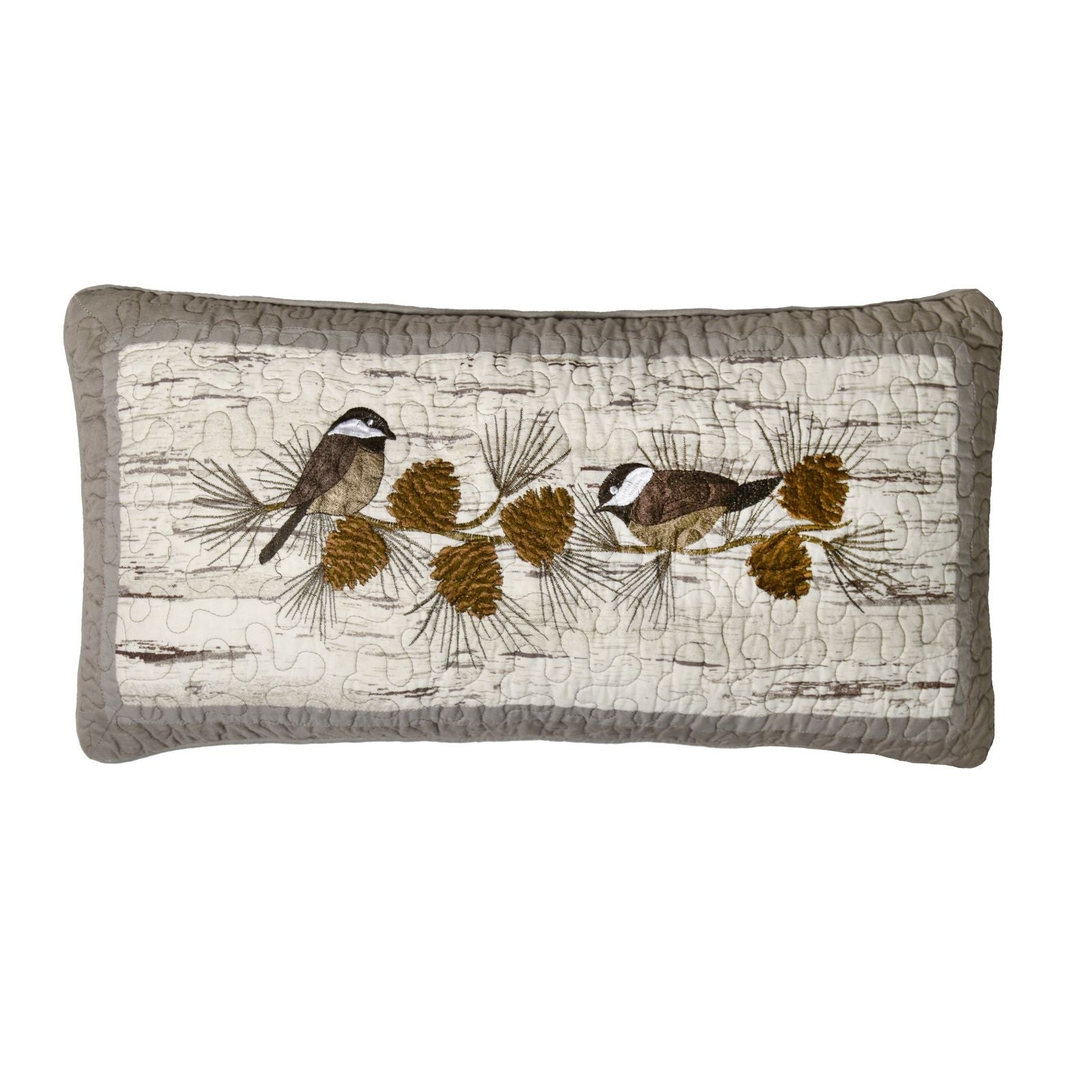 This striking and elegant, outdoor-inspired quilted rectangle accent pillow features adorable chickadees on a birch branch. Colors include smoke and ash grey, white, and brown. Crafted on dense, thick cotton for strength and durability. Coordinates with Donna Sharp Birch Forest Bedding Collection