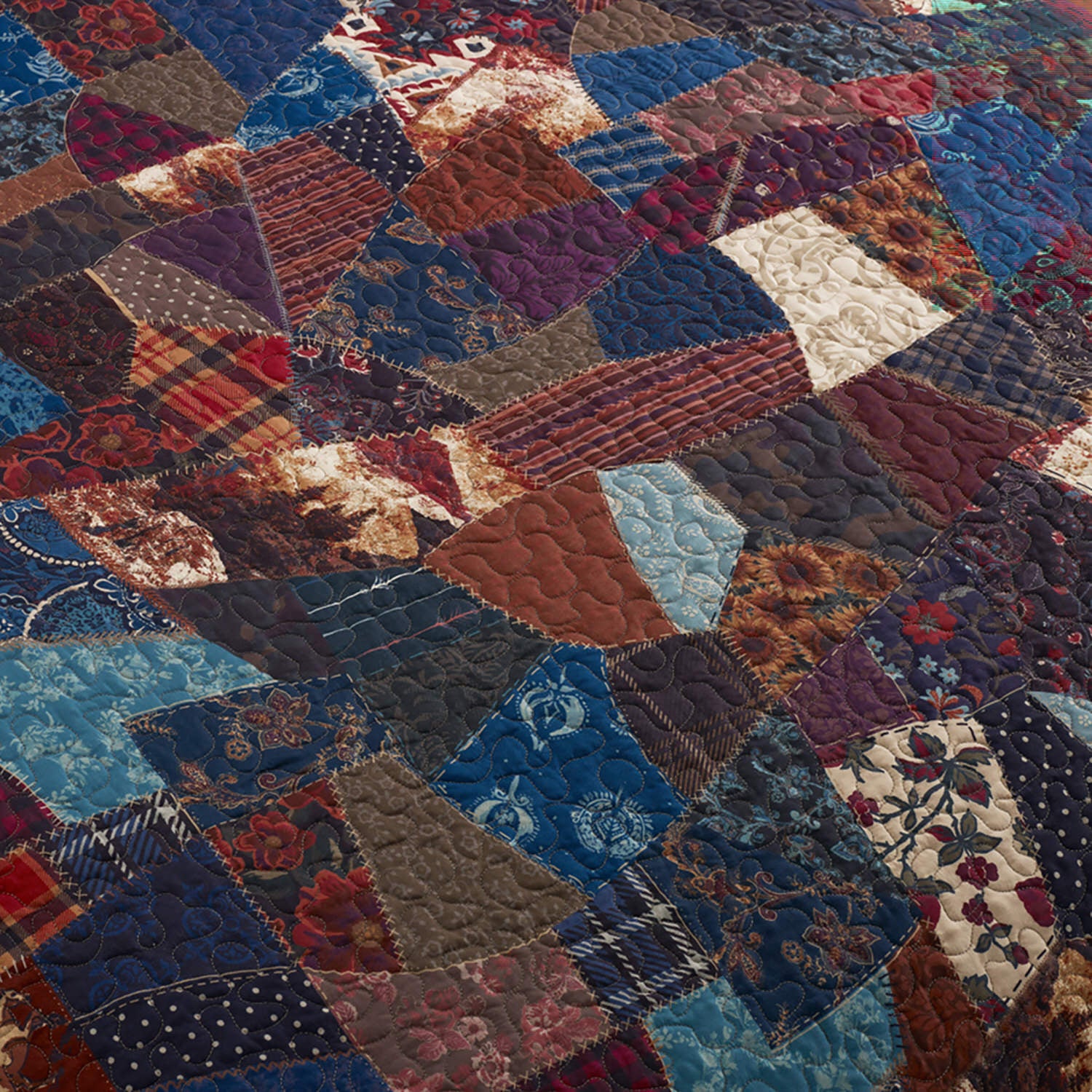 Colorful, uniquely quilted microfiber bedding ensemble inspired by a traditional Crazy Quilt motif, incorporating dynamic fabric patterns for a striking effect with traditional stitching. Looks brilliant with modern and traditional home decor with colors in ivory, sage, burgundy, rust, teal, orange and navy (among many others). Our coordinating shams and accent pillows complete the ensemble.