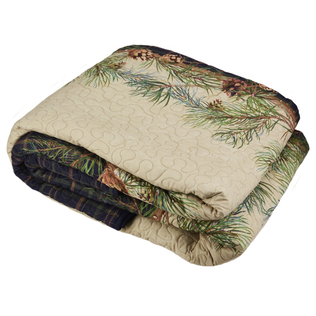 Wrap yourself in the elegance of nature. Donna Sharp Pine Boughs 3-piece comforter bedding set is a gorgeous nature themed design perfect to accommodate any lodge themed bedroom. A border of pine sits against a sleek backdrop of tan and green flannel. Using navy, parchment, tan, olive green, and walnut brown colors on the front, the reverse features a southwest lining with parchment, tan, deer brown, olive green, slate blue and port wine red colors. Enhance your bedroom décor with this lovely rustic design. 100% Polyester, machine washable; King set includes 1 comforter 110" x 90" and 2 king pillowcases 20" x 36"; Queen set includes 1 comforter 90" x 90" and 2 standard pillowcases 20" x 26"; All decorative pillows sold separately.