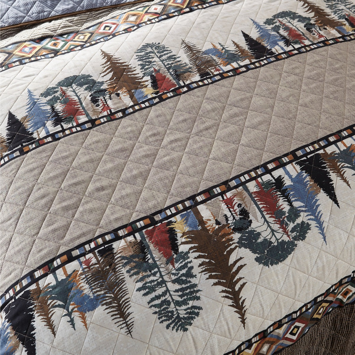 Retro Forest Ultra Comfort Collection 3pc Bedding Set from "Donna Sharp" features a multicolor tree line mirrored amongst geometric motifs and woven patterns. Colors include ivory, taupe, blue-grey, rust, golden yellow, spruce green and black. The set includes a king quilt 110" x 96" and 2 King shams 20" x 36". All accessories sold separately.