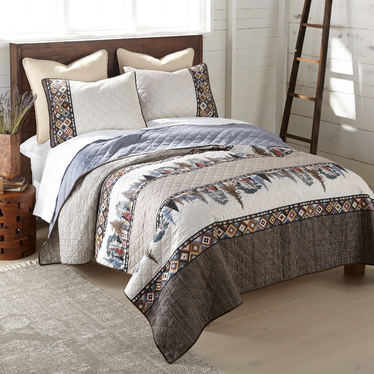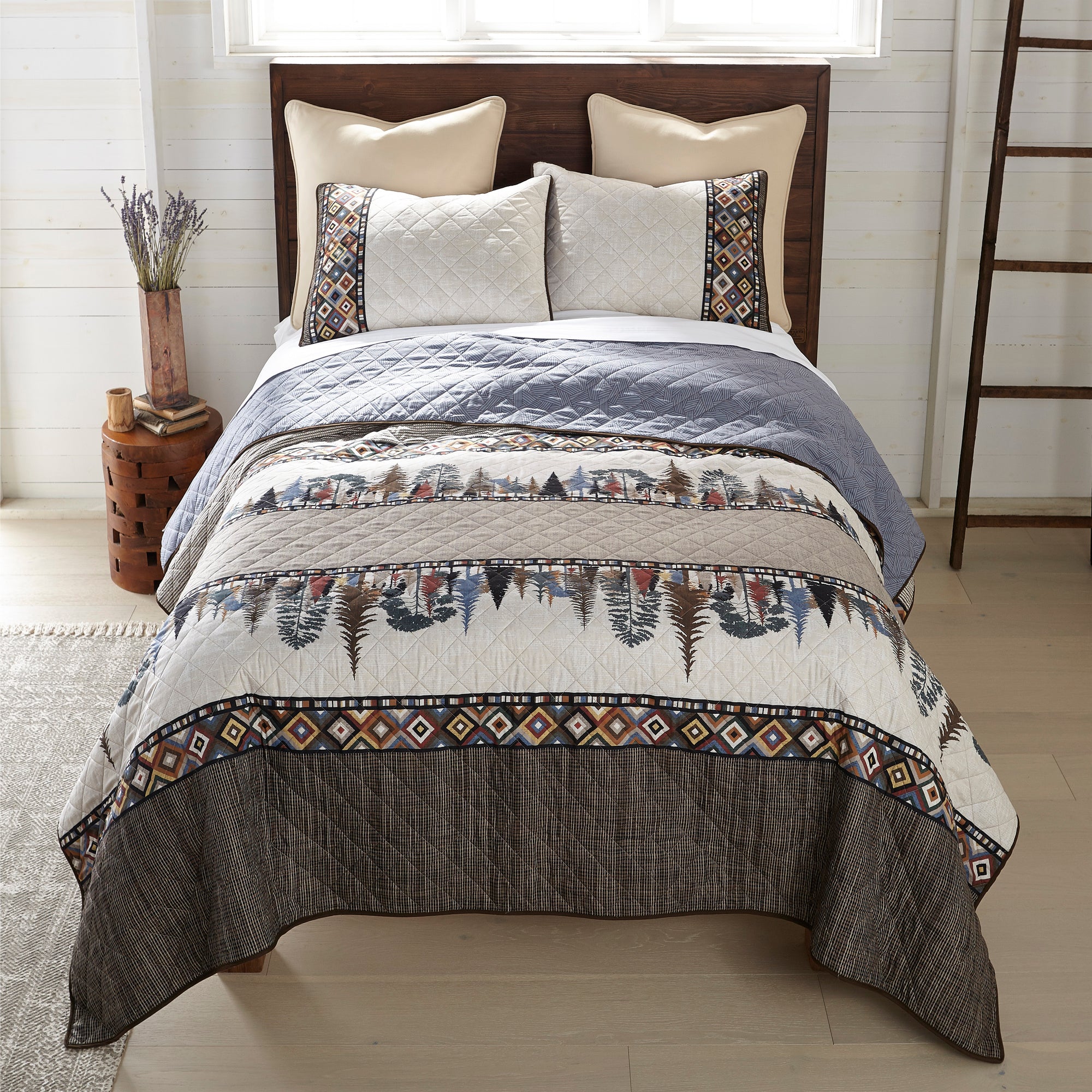 Retro Forest Ultra Comfort Collection 3pc Bedding Set from "Donna Sharp" features a multicolor tree line mirrored amongst geometric motifs and woven patterns. Colors include ivory, taupe, blue-grey, rust, golden yellow, spruce green and black. The set includes a queen quilt 90" x 90" and 2 standard shams 20" x 26". All accessories sold separately.