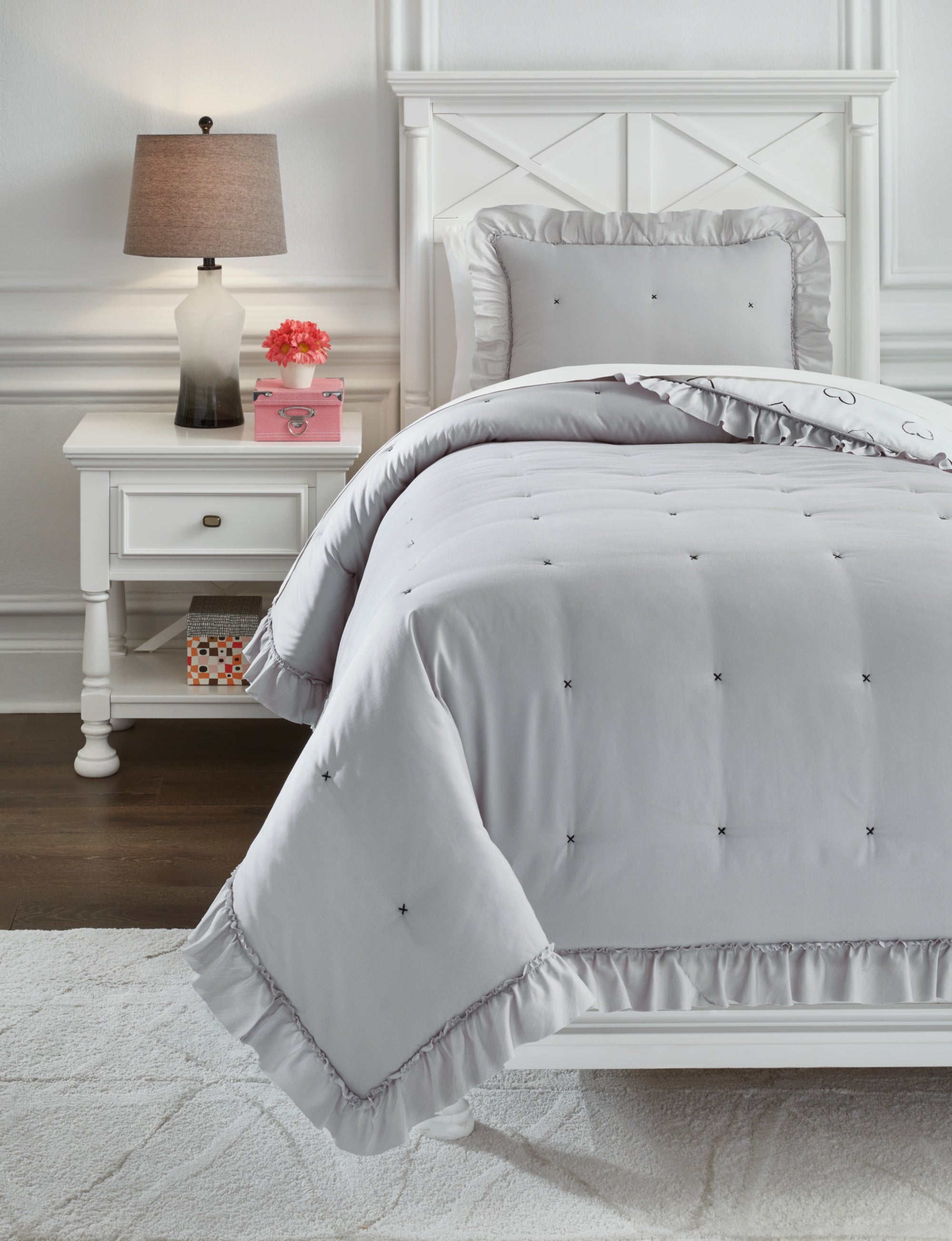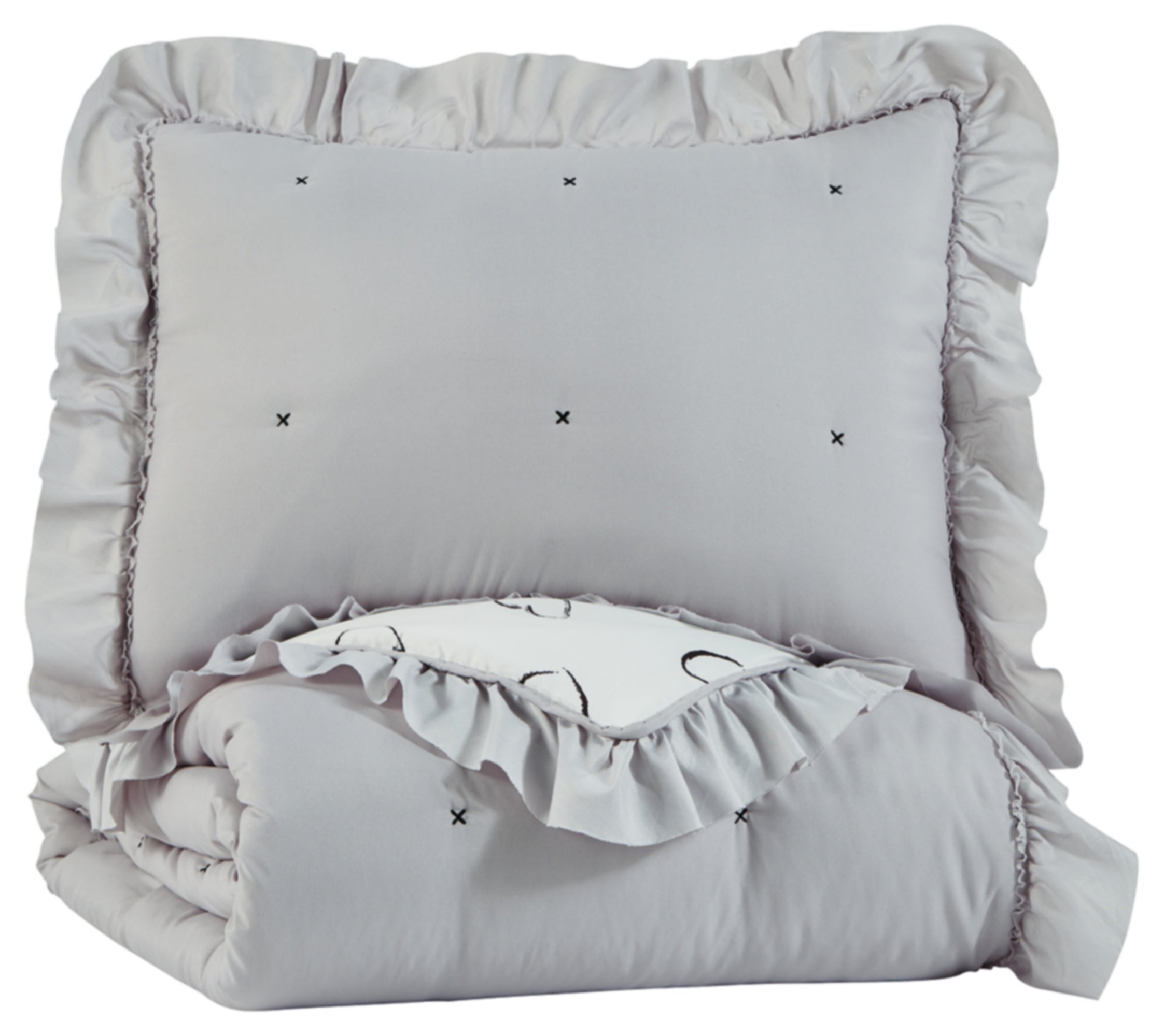 The Hartlen comforter set is fresh, fun and feminine without being too girly-girly. In solid gray with a romantic ruffled flange border and black cross-stitched tufting, it reverses to a black and white heart design that's full of love. Comfortable and practical, your special young lady will feel right at home with her fashion-forward style.