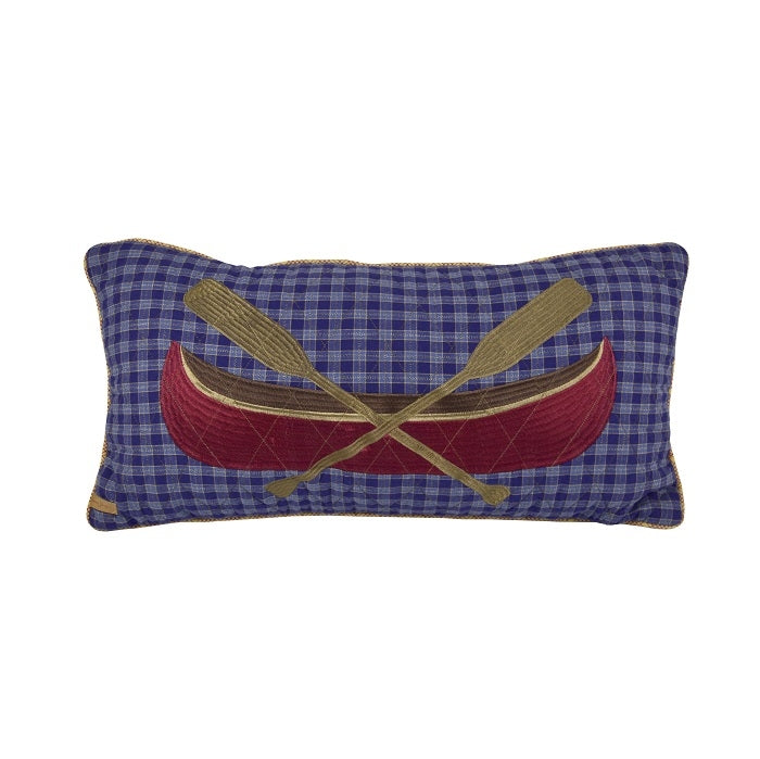 This 100% cotton rectangle accent pillow features a rustic pattern of woven fabrics in shades of navy featuring an embroidred canoe with oars crafted on dense, thick cotton for strength and durability. A true classic that will work in all styles of decor. Coordinates with Donna Sharp Lakehouse Bedding Collection