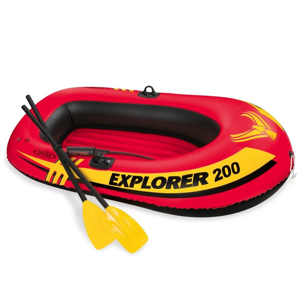 Have a boat race with friends or leisurely cruise around the pool on lazy summer days. This Explorer™ 200, 2-Person inflatable boat features a grab rope, oar locks and soft inflatable floor for easy cruising. Set comes complete with 48in Deluxe Aluminum Oars and a Mini Hand Pump.