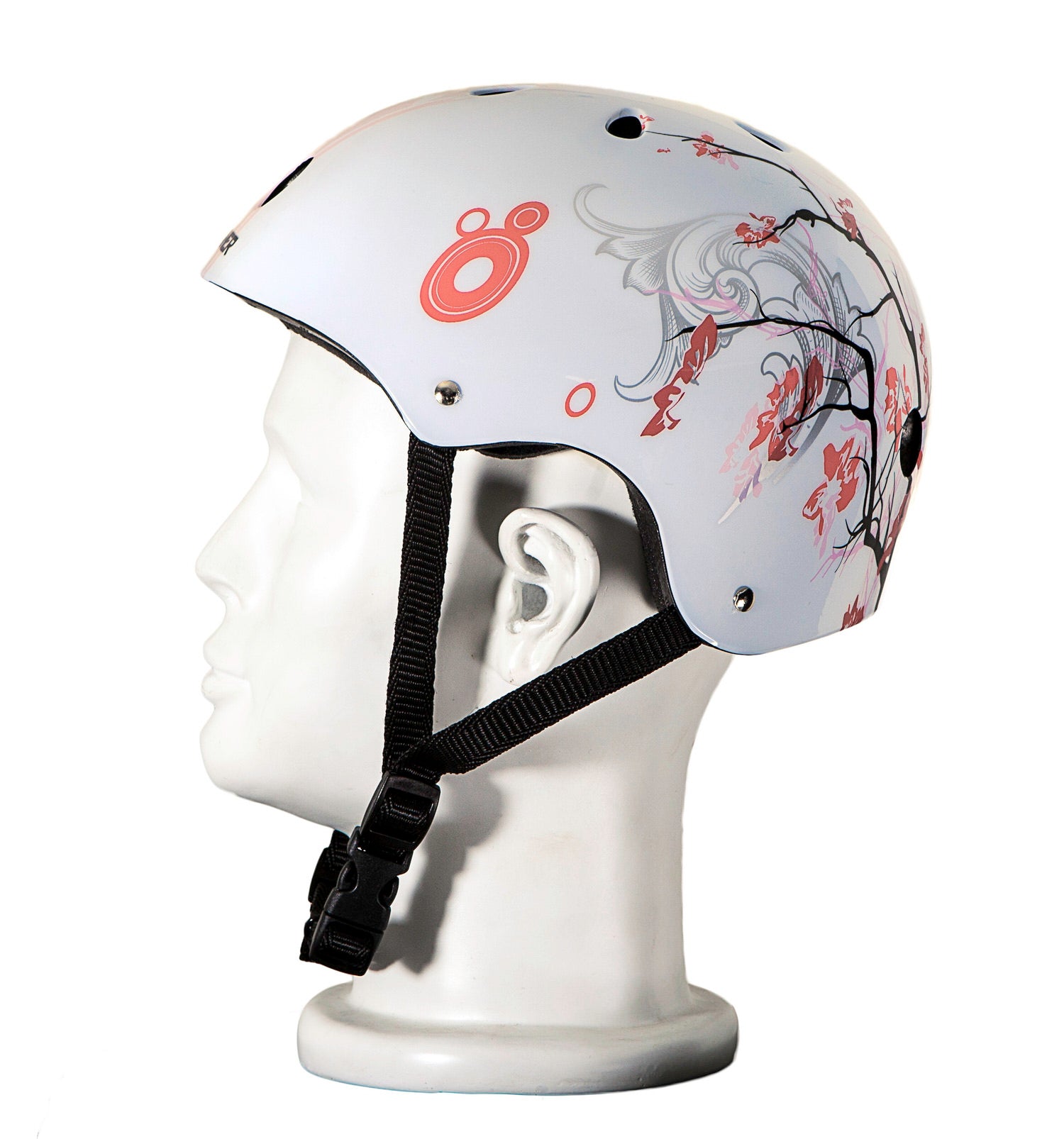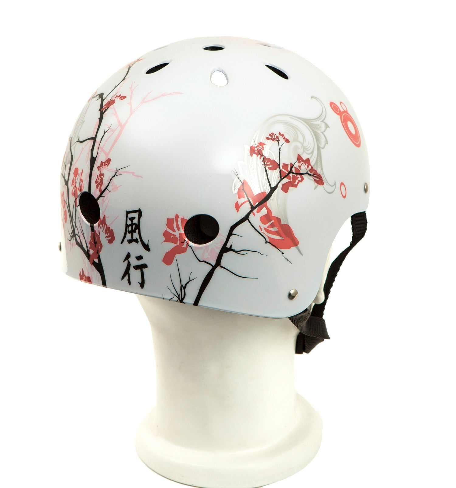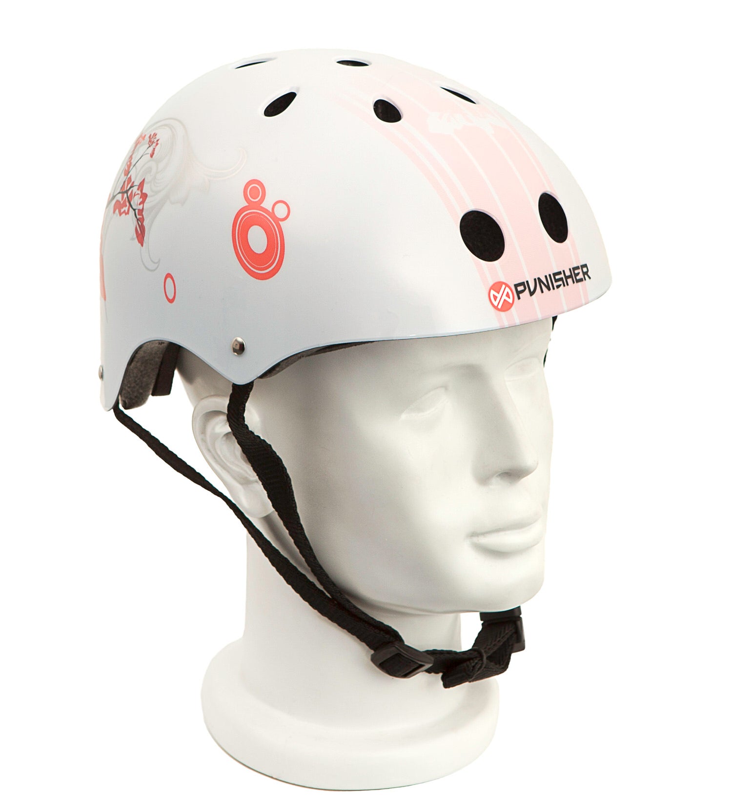 Matches Punisher Cherry Blossom skateboard. Features ABS plastic shell with black EPS foam liner, adjustable chin straps, 11 vents to stay cool and comfortable while skating, skateboarding, BMX-ing, or bike riding, and certified to CPSC safety standard. Size medium, but includes extra pads that will make the helmet a size small equivalent. Measures 6.5"L x 8"W x 10"H.