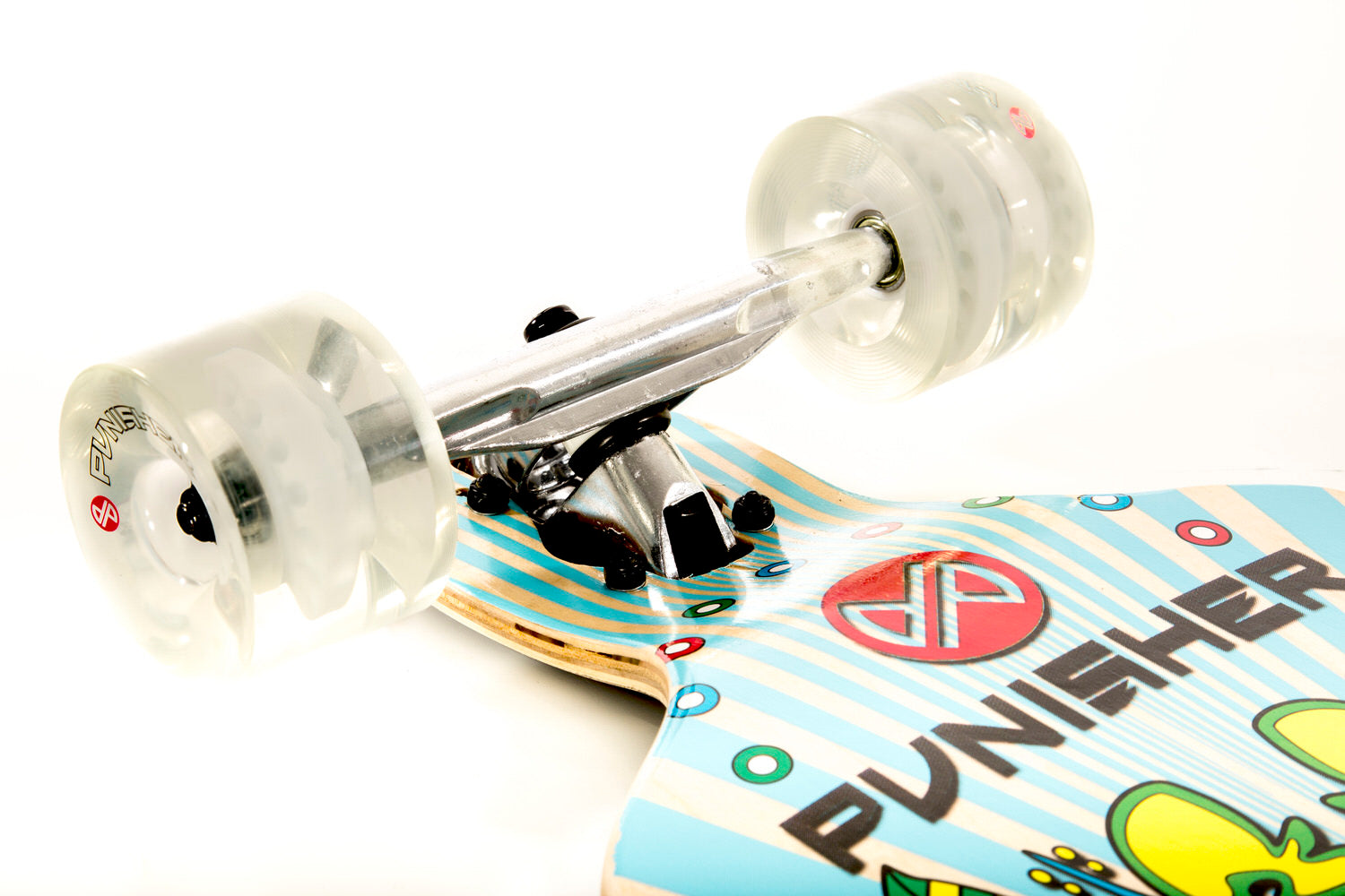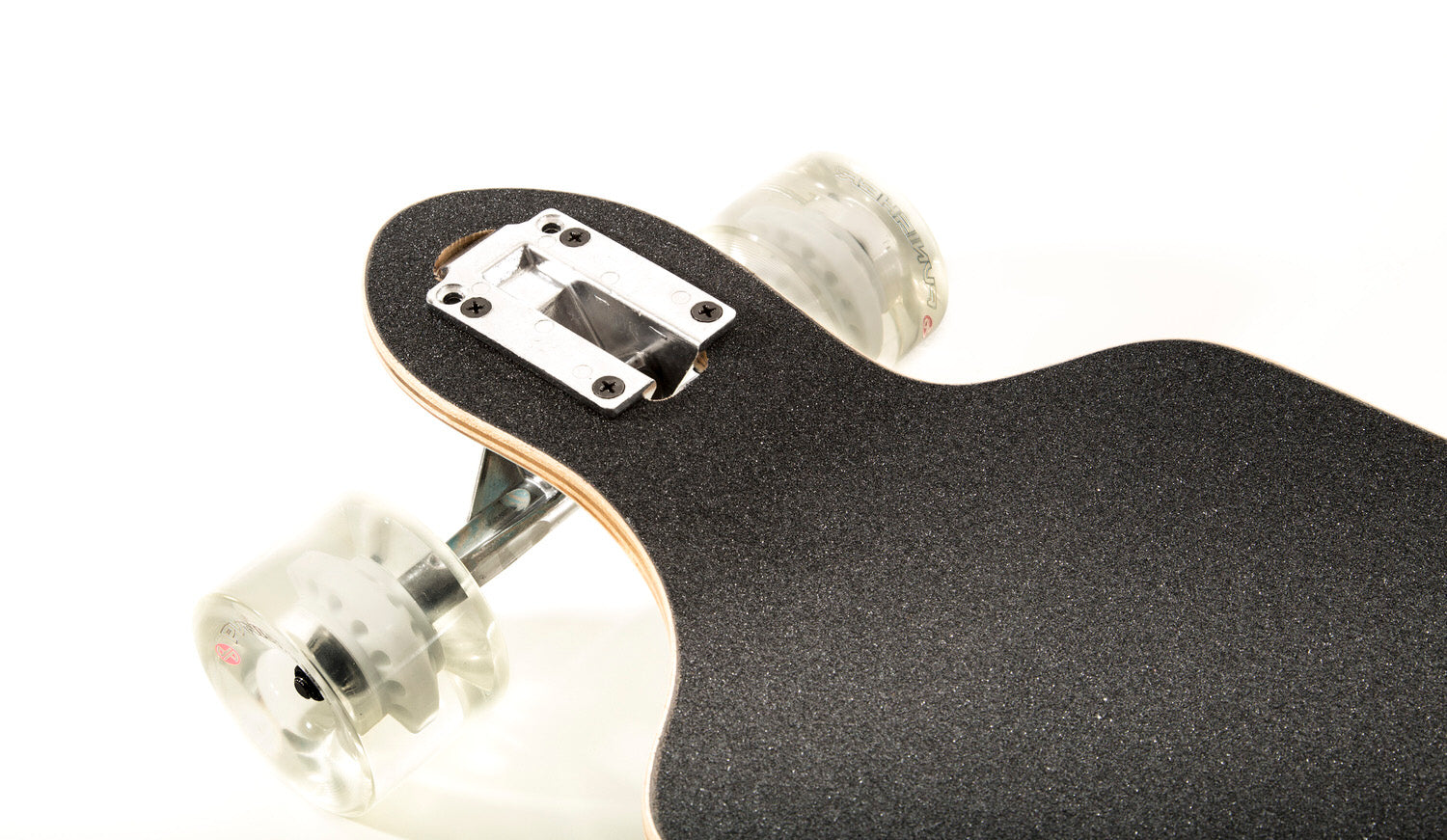 Features 7-ply Canadian maple drop through deck, OS780 grip tape, 7" UB alloy truck & base, ABEC-9 chrome bearings, 76x53mm transparent PU casted wheels, and PU white cushion with black & white logo. Measures 9"W x 40"L.