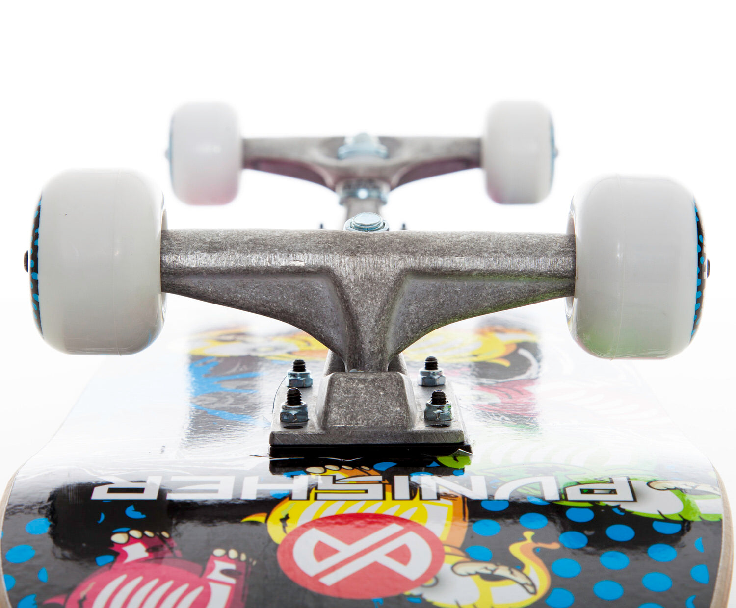 Matches Punisher Elephantasm helmet. Features 9-ply maple double kick concave deck, ABEC-5 bearings, 5" v-style alloy trucks & base, 50x30 mm PU injection molded wheels, and PE riser pad with PU cushion. Measures 31"L x 7.5"W.