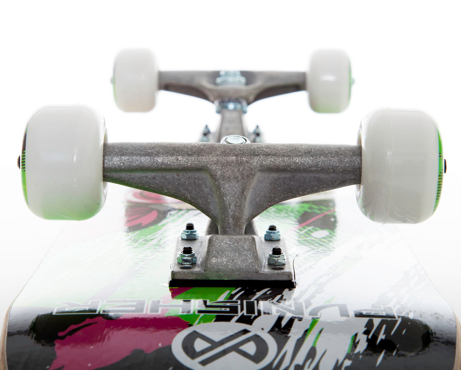 Matches Punisher Jinx helmet. Features 9-ply maple double kick concave deck, ABEC-5 bearings, 5" v-style alloy trucks & base, 50x30 mm PU injection molded wheels, and PE riser pad with PU cushion. Measures 31"L x 7.5"W.