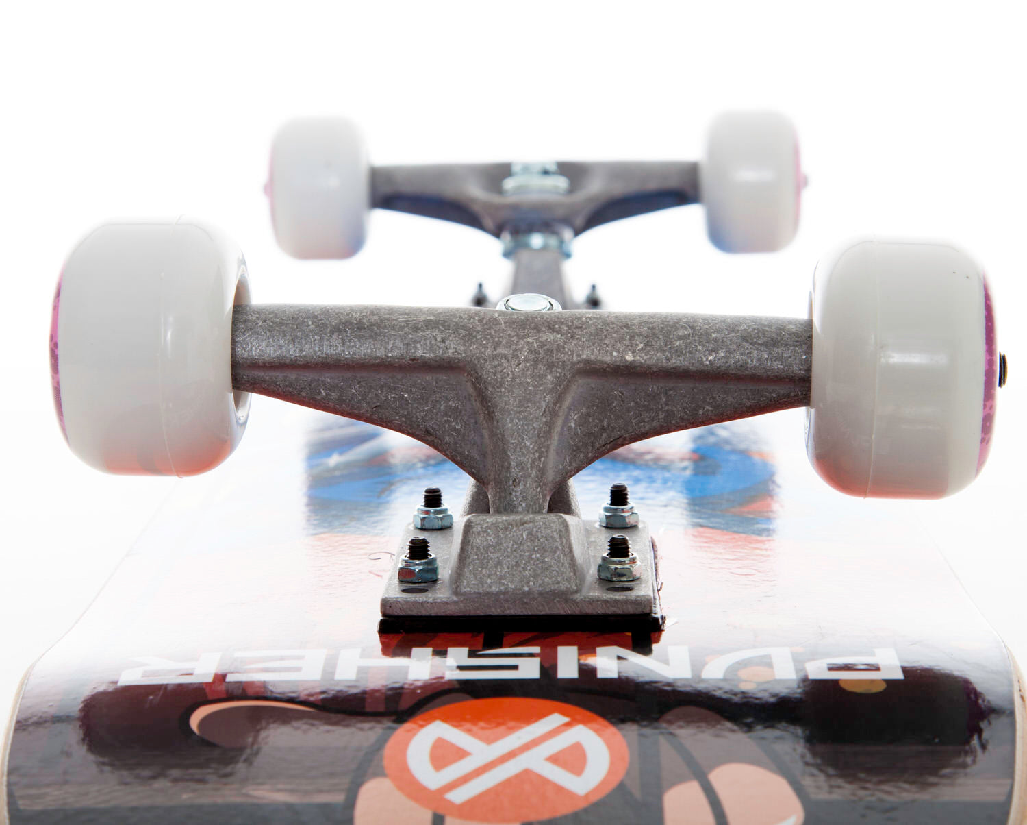Features 9-ply maple double kick concave deck, ABEC-5 bearings, 5" v-style alloy trucks & base, 50x30 mm PU injection molded wheels, and PE riser pad with PU cushion. Measures 31"L x 7.5"W.