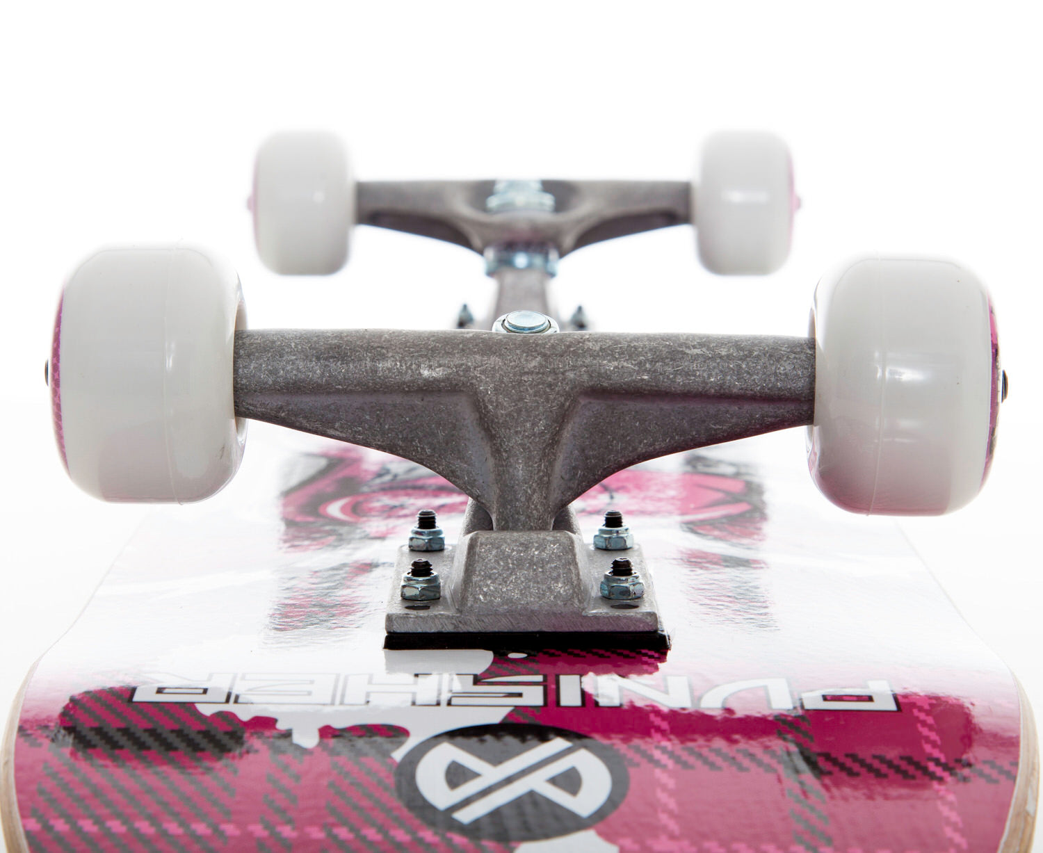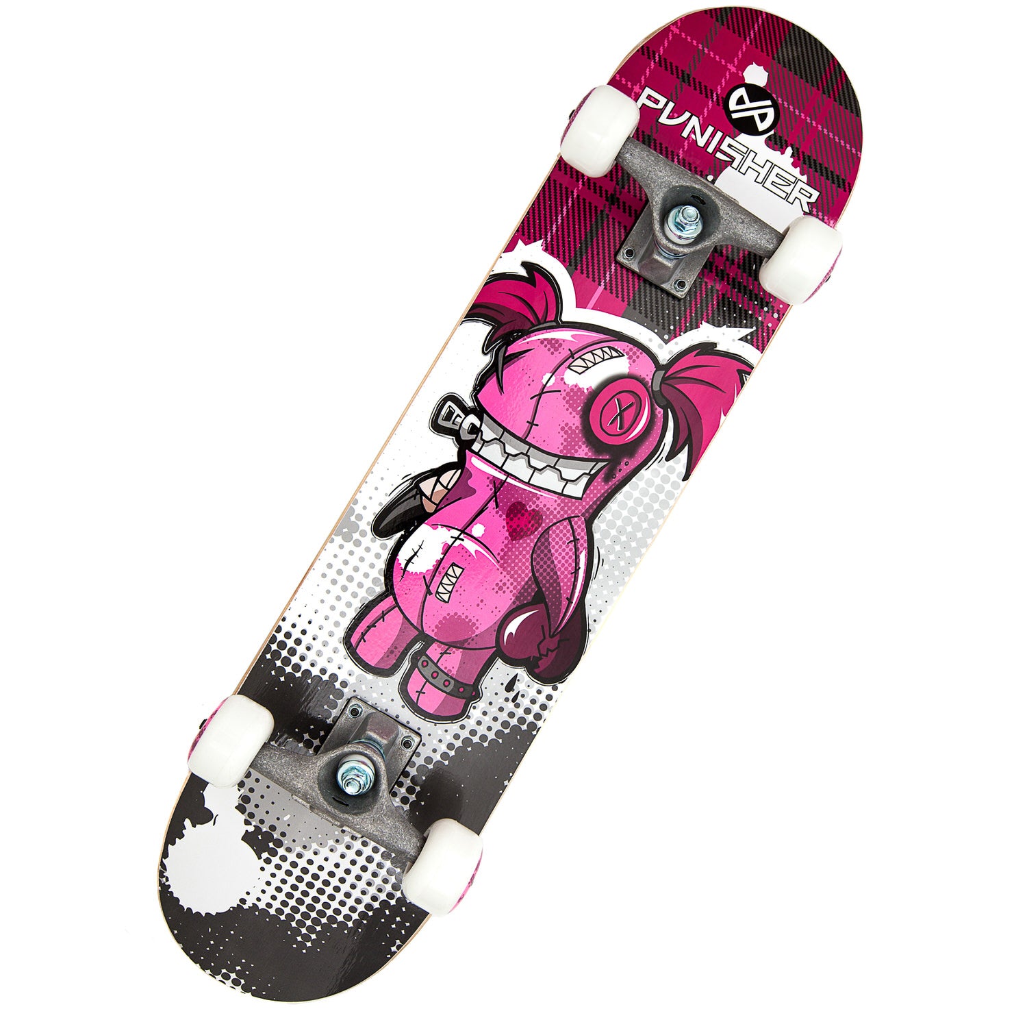Features 9-ply maple double kick concave deck, ABEC-5 bearings, 5" v-style alloy trucks & base, 50x30 mm PU injection molded wheels, and PE riser pad with PU cushion. Measures 31"L x 7.5"W.