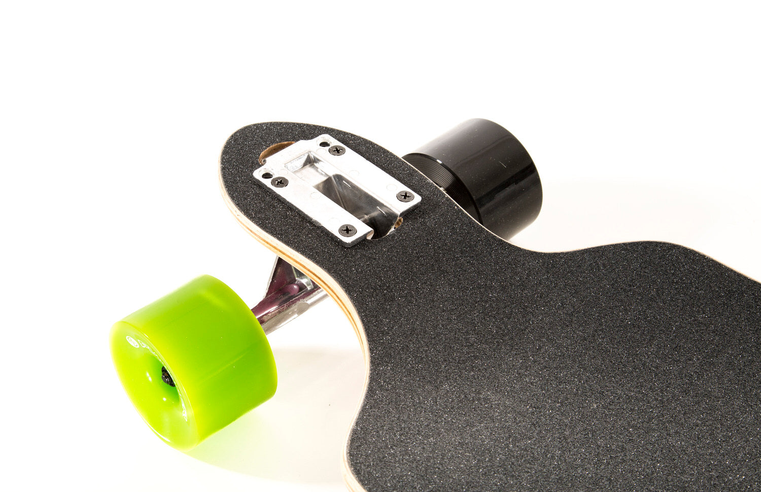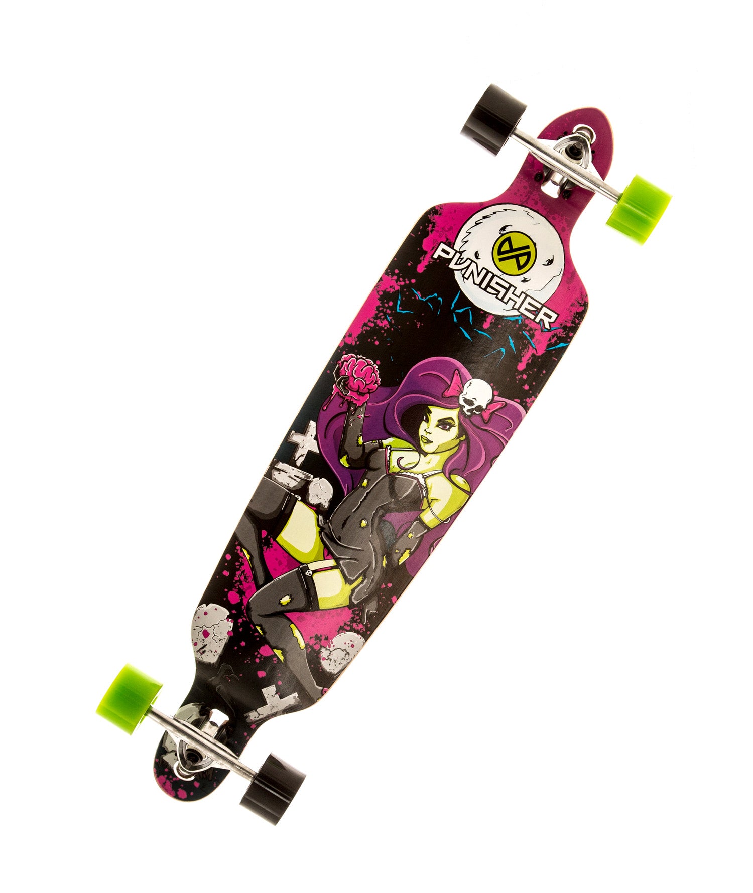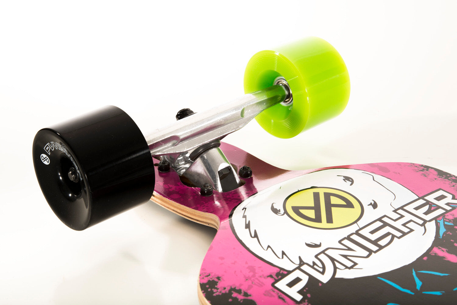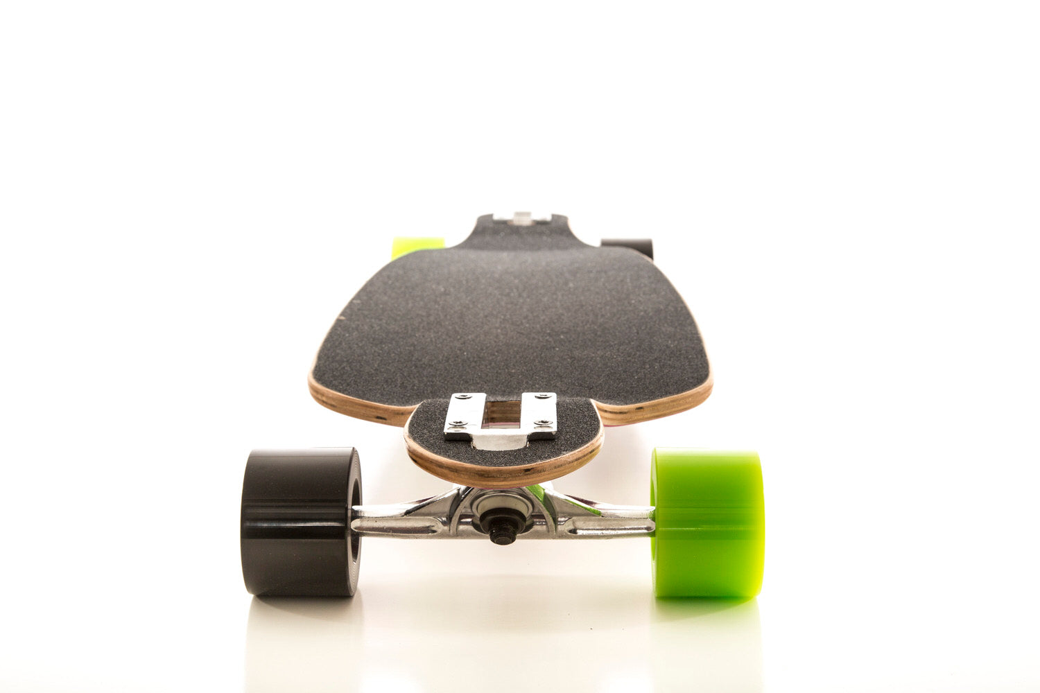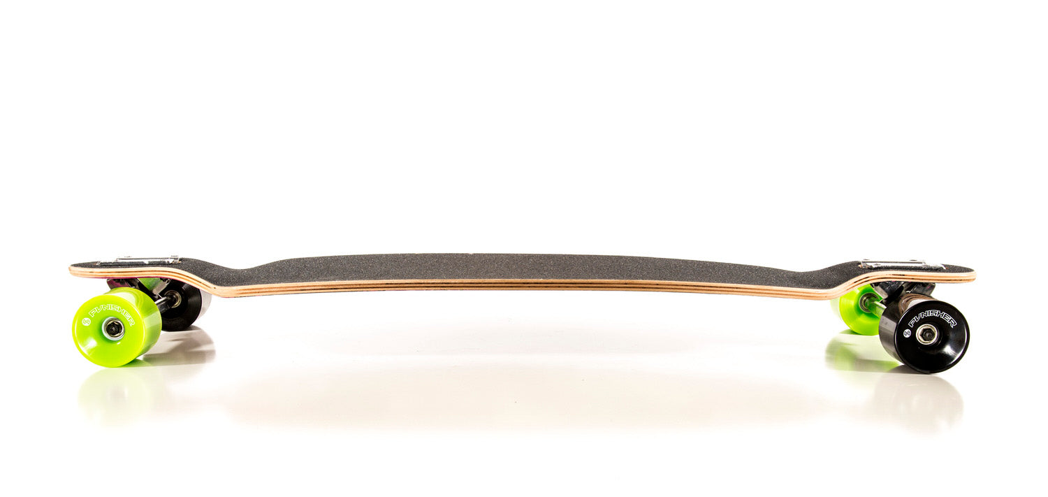 Features 7-ply Canadian maple drop through deck, OS780 grip tape, 7" UB alloy truck & base, ABEC-9 chrome bearings, 76x53mm black and lime green, PU casted wheels, and PU white cushion with black & white logo. Measures 40"L x 9"W x 4"H.