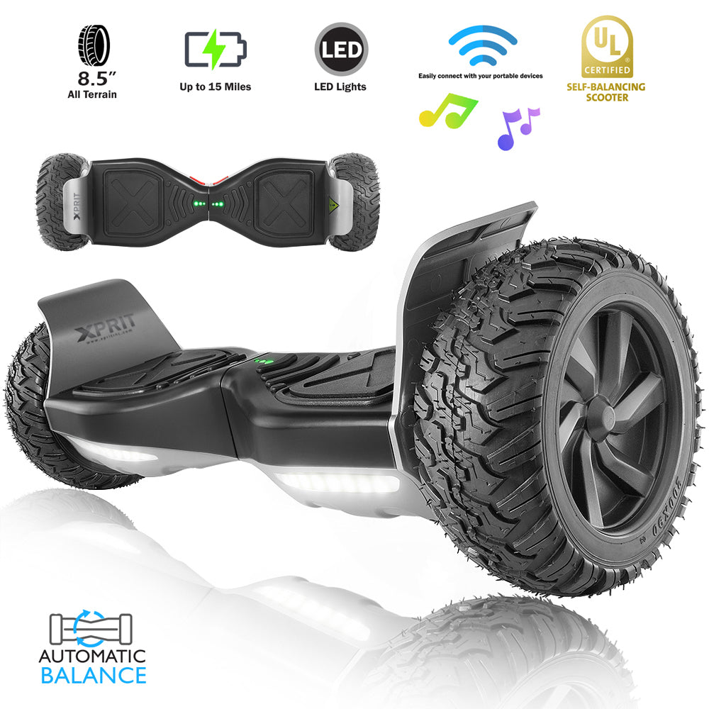 Equipped with wireless Bluetooth function and 8.5-inch threaded tires allows a smooth ride over gravel and sandy terrain. You can even ride up-hill up to a 15-degree slope. The Hummer Hoverboard has bright white front LEDs that help ensure a safer ride and is unique with its aluminum bumper panels that prevent from rolling.The XPRIT 8.5 inch All-Terrain Hoverboard has been UL certified and each board comes with a hologram certificate stating that it has passed UL 2272 Certification.