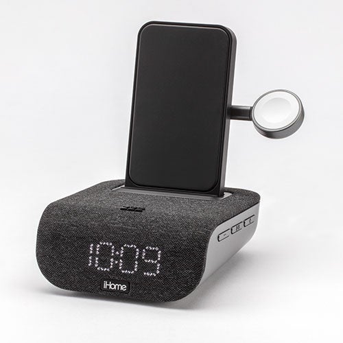 TimeBase Pro+ offers extreme versatility. Wirelessly stream audio via Bluetooth. 7.5W/10W Charging for compatible Qi devices. Integrated charging arm for Apple Watches. 5W USB-A charging port. 7-5-2 Alarms - wake to different sources everyday, work week, and weekend. Programmable snooze from 1-29 minutes. Speakerphone with digital eco canceling and talk/end button. Dimmable backlit display. Sure Alarm backup. Designer fabric grill. AC Adapter 100V-240V.