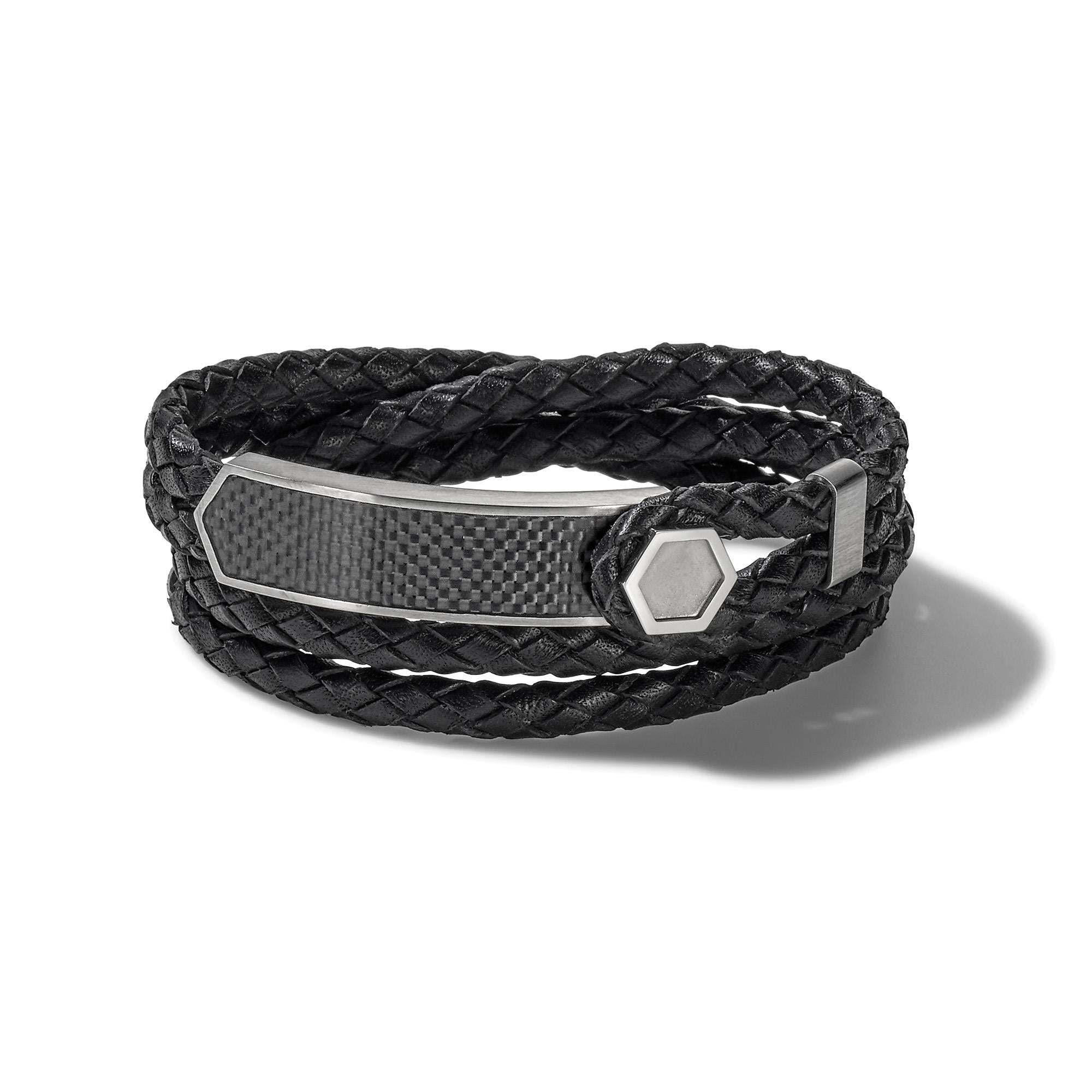 Casual black braided leather double-wrap, double-strand bracelet. The looped leather end secures to a brushed stainless steel plaque inlayed with black carbon fiber and detailed with the iconic Precisionist bolt closure. Wrist Measurement for Large is 7.5 - 8.0 inches.