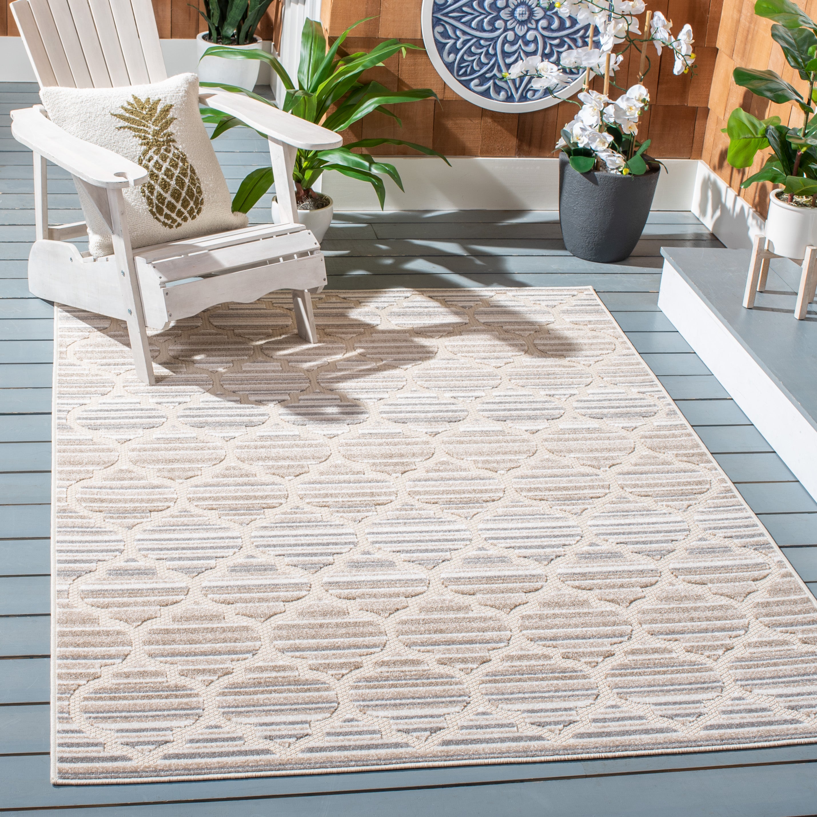 Cabana Indoor/Outdoor Rugs offer a selection of elaborate floor coverings for any busy area of the home, inside or out. Playful florals, lush vines, and fanciful geometric motifs brim with "staycation" vibes on any deck, porch, or patio. Cabana patio rugs are made using durable synthetic yarns for resistance to weather, wear, mold, mildew, and fading from the sun.