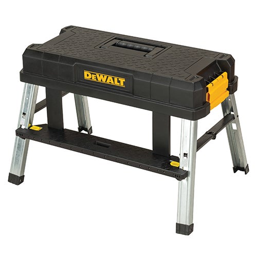 2-in-1 Design to store tools and step stool assist. Lightweight design is easy to carry and transport. Sturdy aluminum legs with non-marring feet. Ergonomic handle for easy carrying. 18" platform height. Dual use side latch. Lock the tool box and allow mobility for elevated tote. 300lb Weight capacity. 66lb Load capacity.