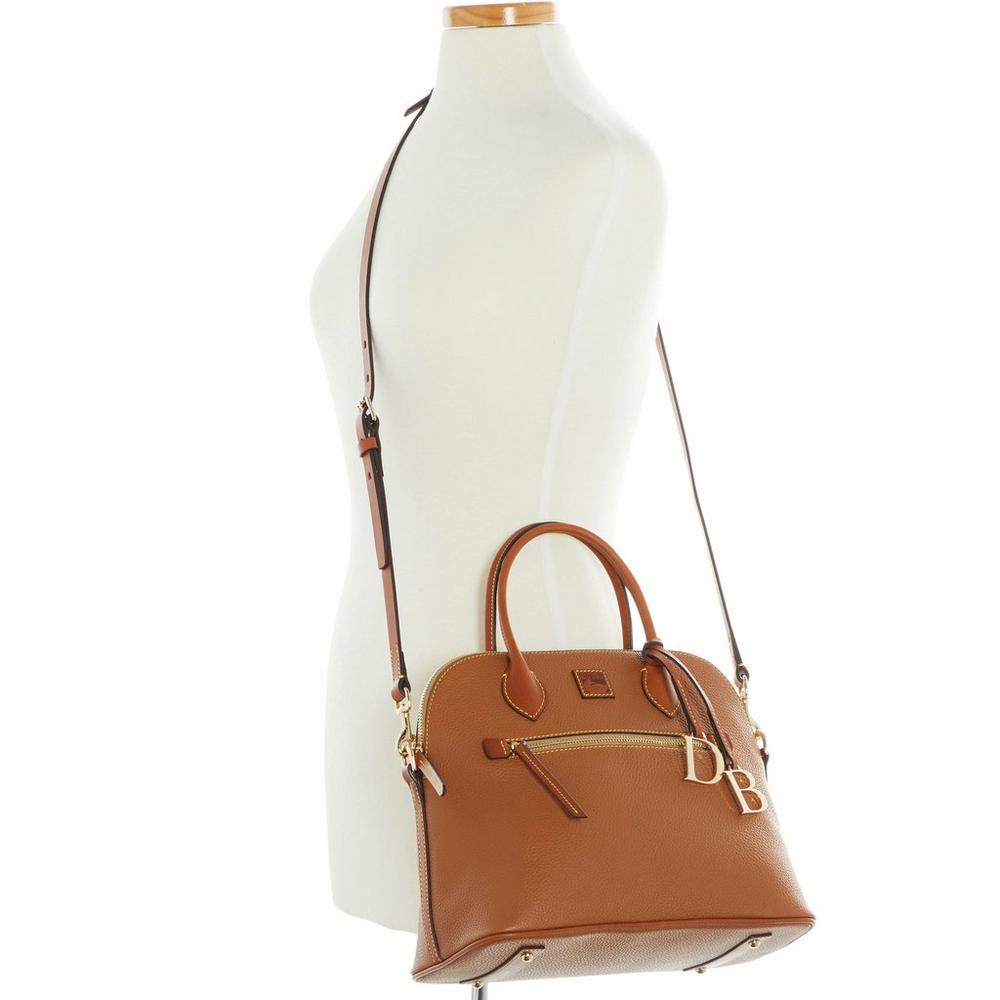 Type/Size: Large Satchel; Dimensions: 9.5"H x 6.5"W x 12"D; Double carry handle with 4.5" drop; Detachable/adjustable shoulder strap with 21.5" drop; Color: Caramel; Material: Pebbled leather; Top zippered closure; Canvas lining; Exterior zippered pocket; 1 interior zippered pocket; 2 interior slip pockets; Inside key hook; Removable, jewelry-grade D&B adornment; Protective feet