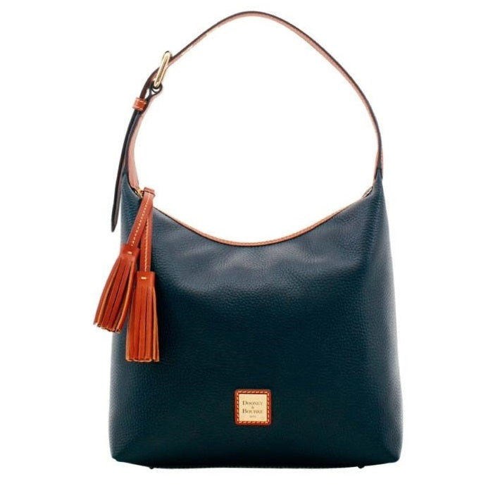 The Paige Sac is designed to be comfortably worn on the shoulder. This enduring hobo style will last through trends and generations with durable pebbled leather and classic tassels. The smooth leather strap features a belt-like buckle that adds a fun design element and also guarantees a customized fit. Features 2 inside pockets, 1 inside zip pocket, a cell phone pocket, and an inside key hook. When you set down your bag there is no need to worry about the bottom getting dirty with the metal feet protecting your bag. Handle drop length 11". A top tassel zipper closure keeps bag contents secure. Color: Black with brown trim. Dimensions: H 9.5" x W 6" x D 11.5".