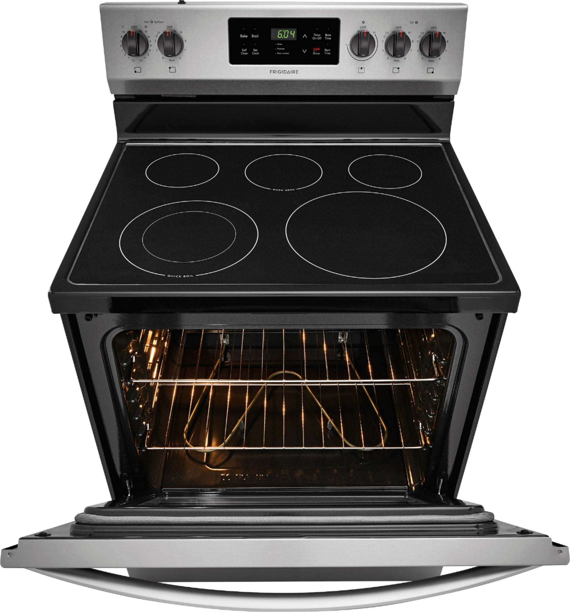 Prepare meals more efficiently with this 30-inch Frigidaire electric range. It has an extra-large 12-inch element that provides better surface contact for bigger pots and pans and a convenient 3000W burner to boil water faster. This Frigidaire electric range has a 100W warming zone to keep prepared foods at ready-to-serve temperatures.