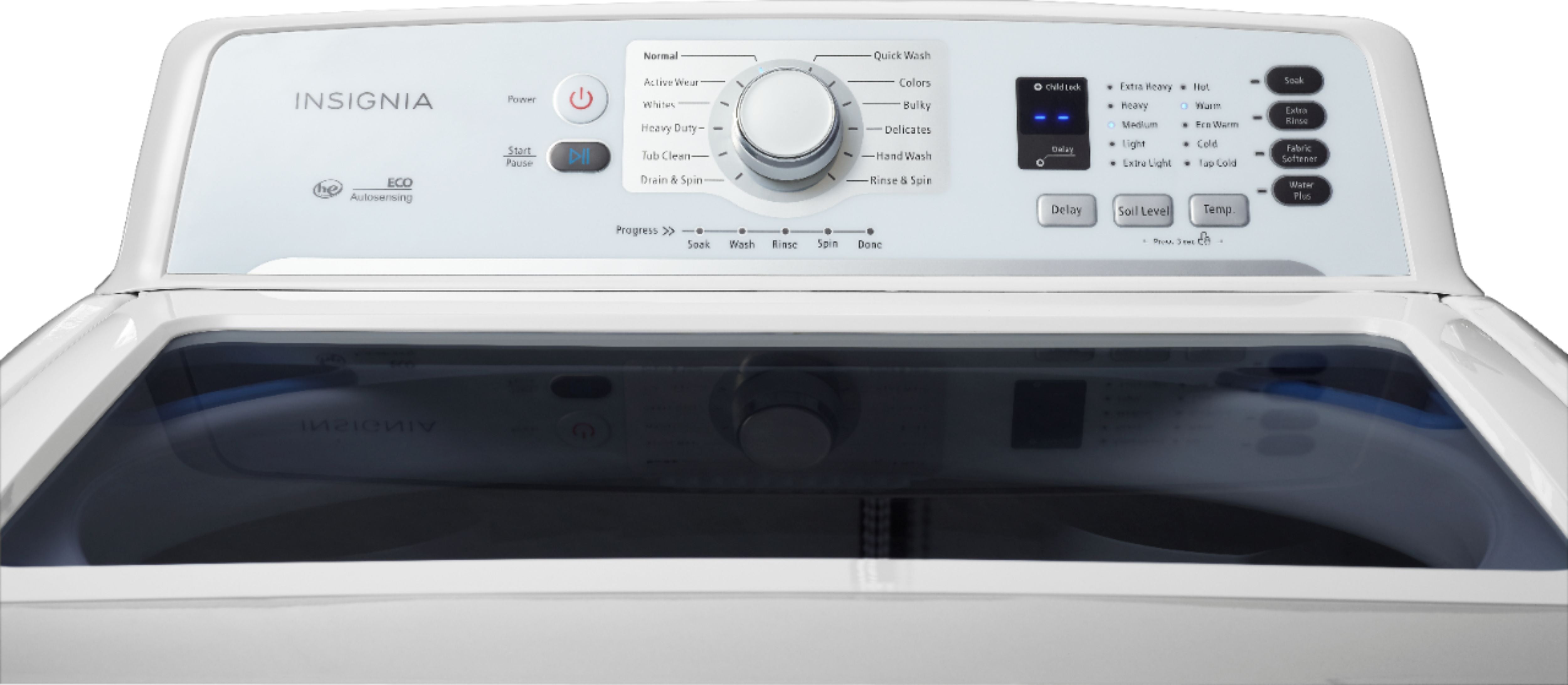 Simplify laundry day tasks with this 4.1 cu. ft. high efficiency Insignia washer. It has eleven settings to accommodate bulky comforters or delicate fabrics and the delay button lets you set a timer up to 24 hours in advance. This top-load Insignia washer has a digital display that shows the time remaining in the current cycle so you can remove items promptly.