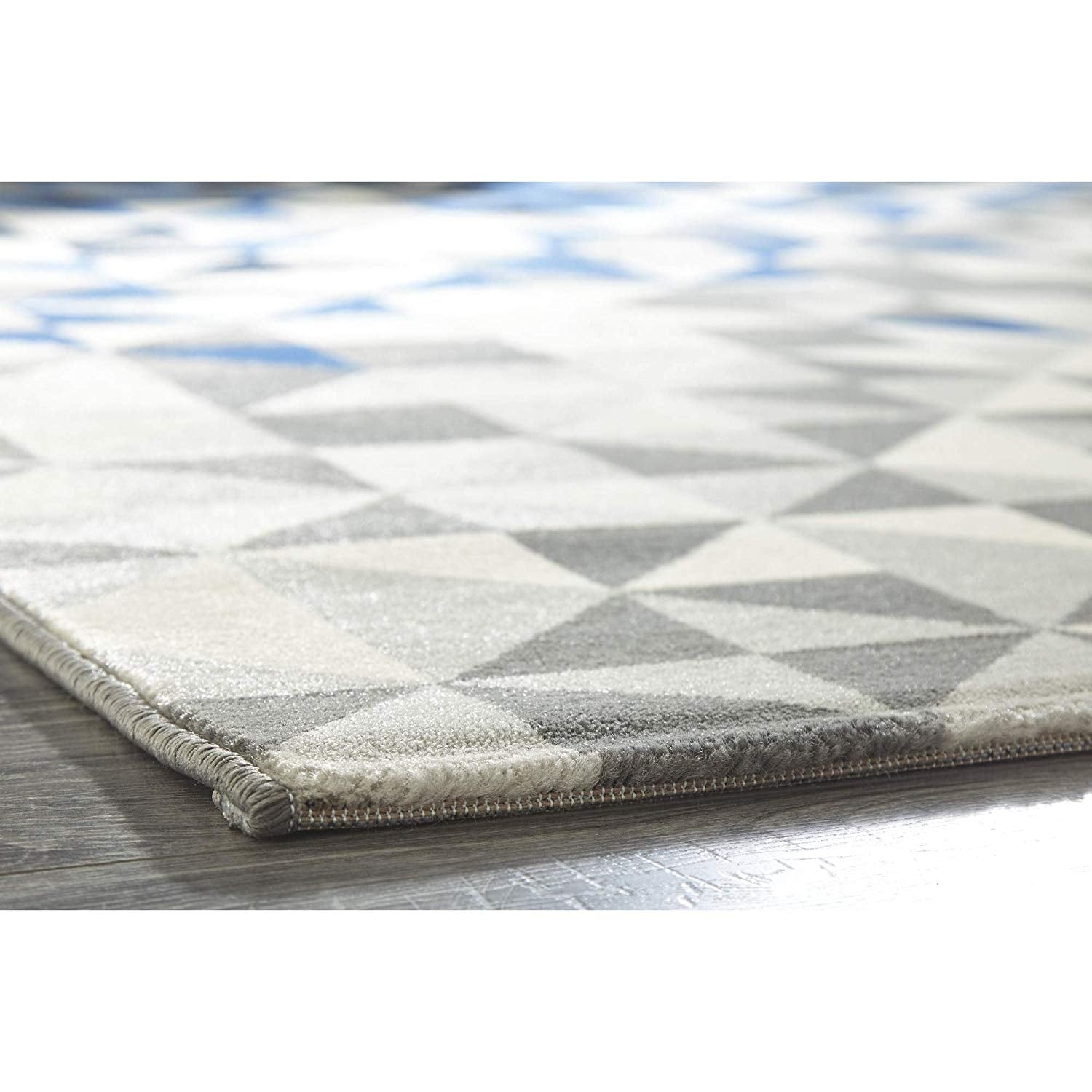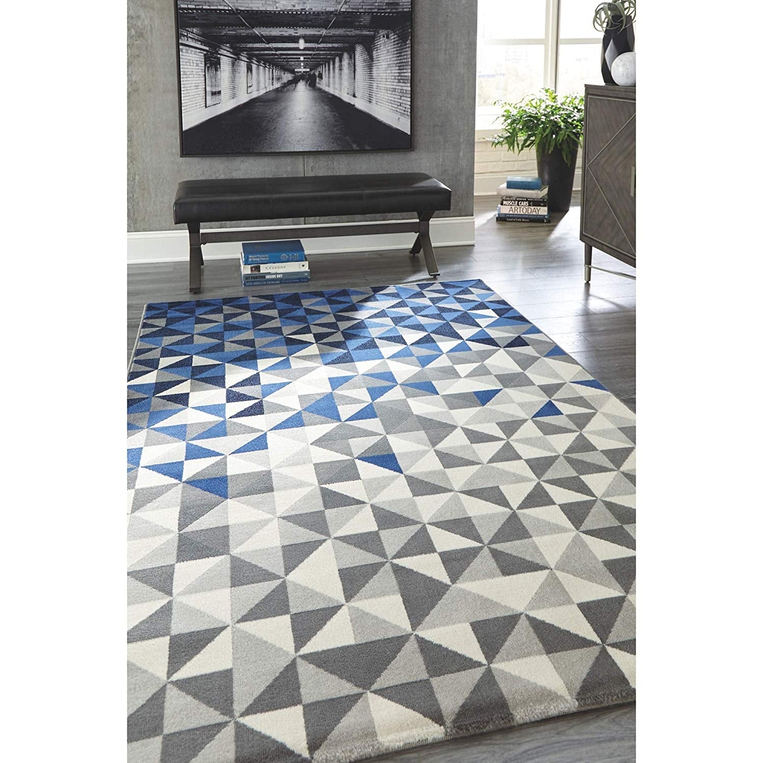 Contemporary triangles in black, blue, gray and white make a striking debut on this rug. The gradient, along with soft pile, will be sure to add modern flair and eye-catching interest underfoot.