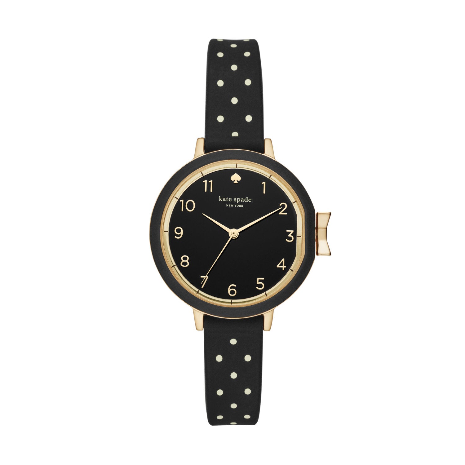 Features the Kate Spade signature spade logo at 12 position. Traditional buckle closure. Gold-tone bow-shaped crown. Stainless steel black and gold-tone case and bezel. Strap width: 12mm. Case size: 34mm. Case thickness: 7mm. Water resistant to 30 M.