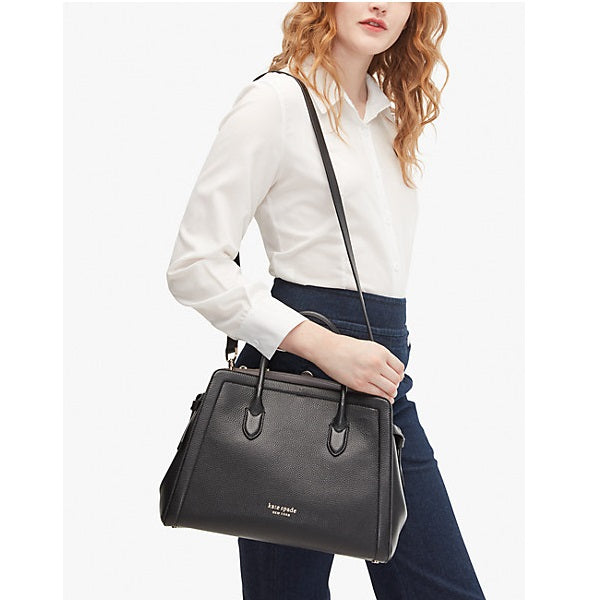 Meet the Knott Large Satchel. You'll notice it has clever cinched knotted sides, but that's not the only reason it earned its name. Multiple pockets organize everything. There's room enough to fit your essentials, even an iPad. It's the satchel that ties it all together.