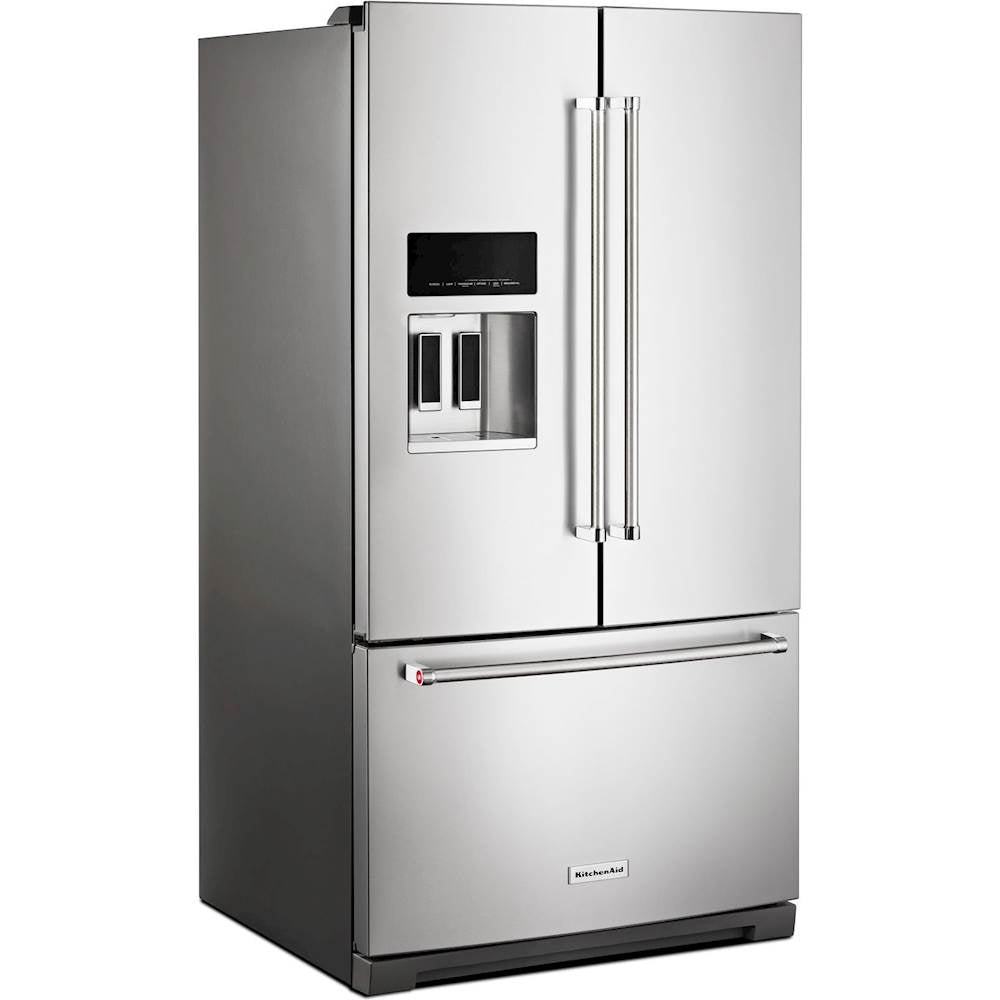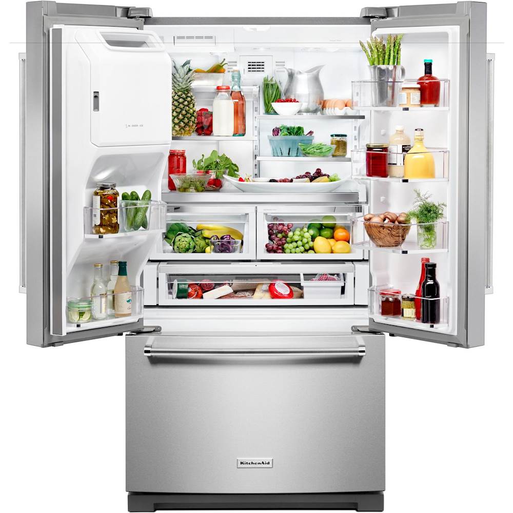 This 26.8 cu. ft. french door refrigerator helps fresh produce stay that way with the ExtendFresh Temperature Management System. A pull-out tray accommodates large platters with ease while a FreshChill Temperature-Controlled Full-Width Pantry lets you optimize temperature and airflow for the specific food you're storing. The refined interior design features elegant metallic accents and a PrintShield finish resists exterior smudges.