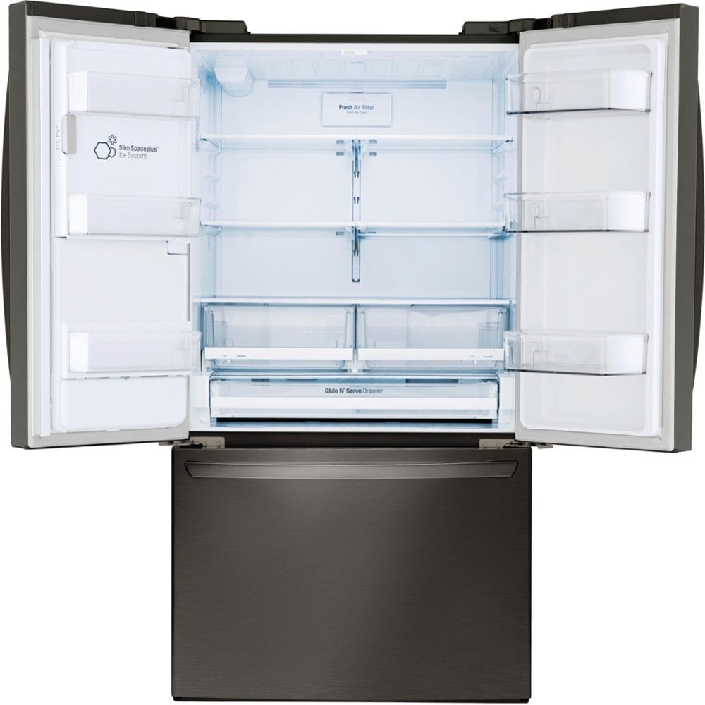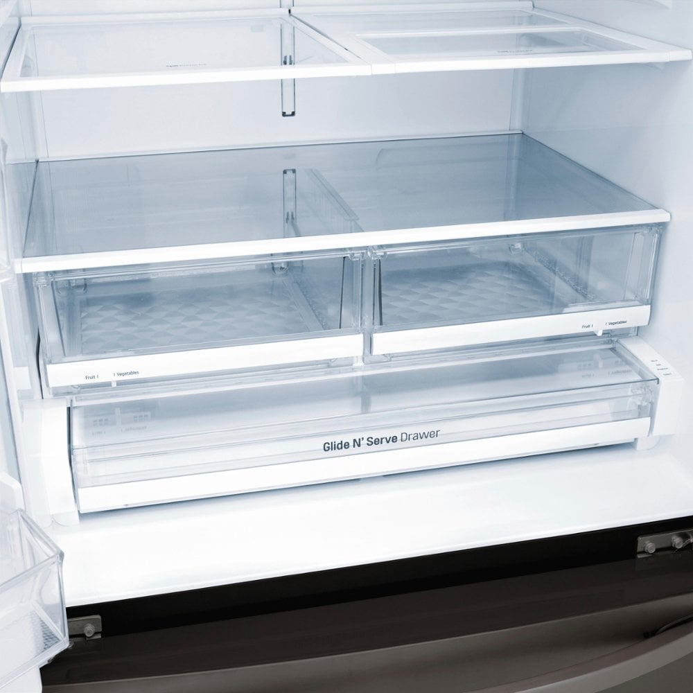 Store groceries and serve guests from the beautiful design of this LG French door refrigerator. Adjustable shelving lets you customize your cooling, and a Glide N'Serve drawer is ideal for storing vegetable trays and deli meats. This LG French door refrigerator features a stunning black stainless steel exterior for a modern upgraded look.