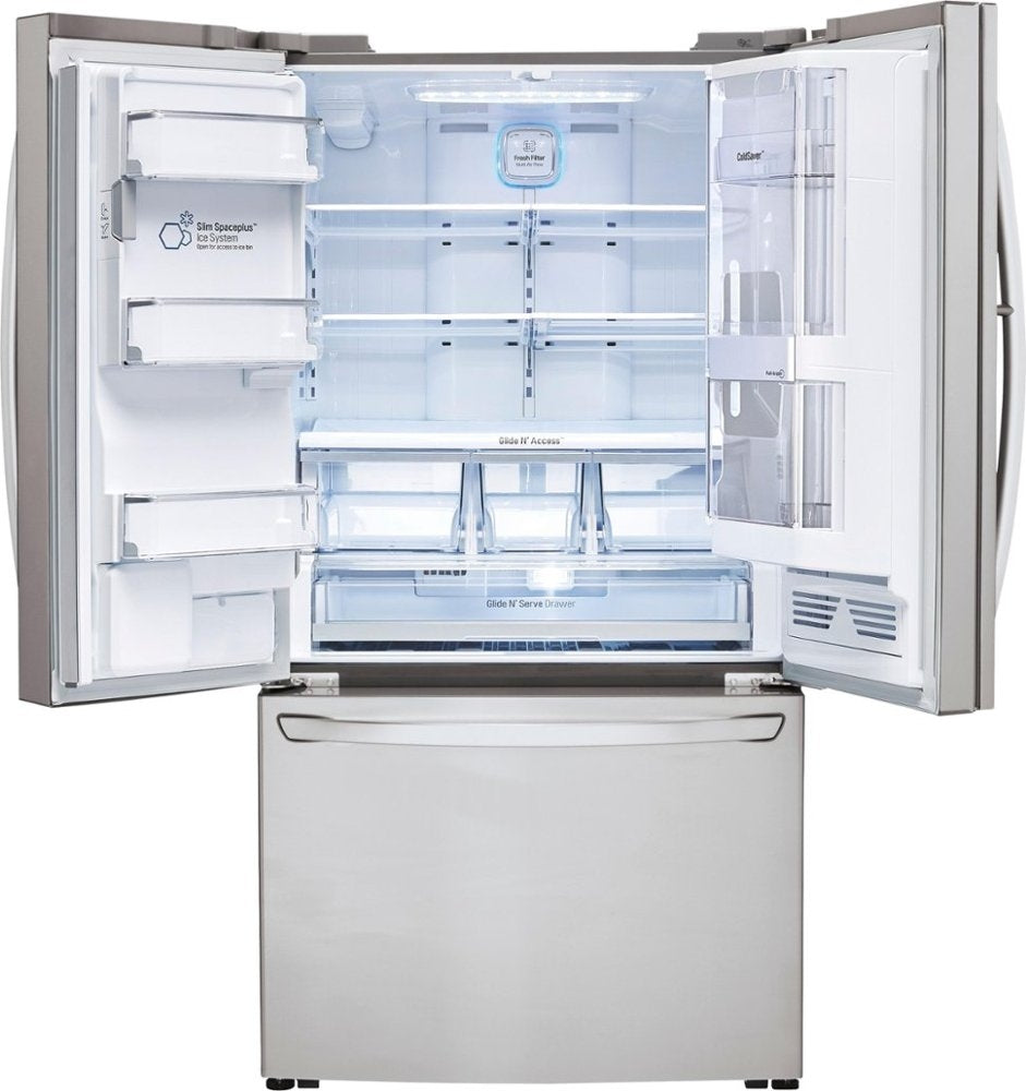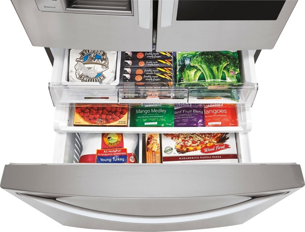 Check out snack choices without letting out the cold air with this three-door LG refrigerator. Its illuminated window lets you see what's inside before you open it, and its external dispenser provides ice and water with a touch. This 30 cu. ft. LG refrigerator has a three-level pull-drawer freezer for easy organization.