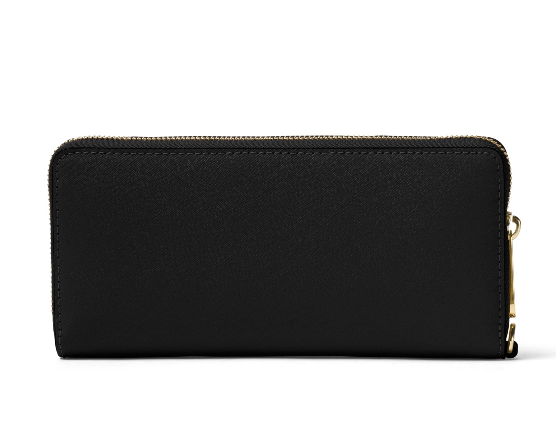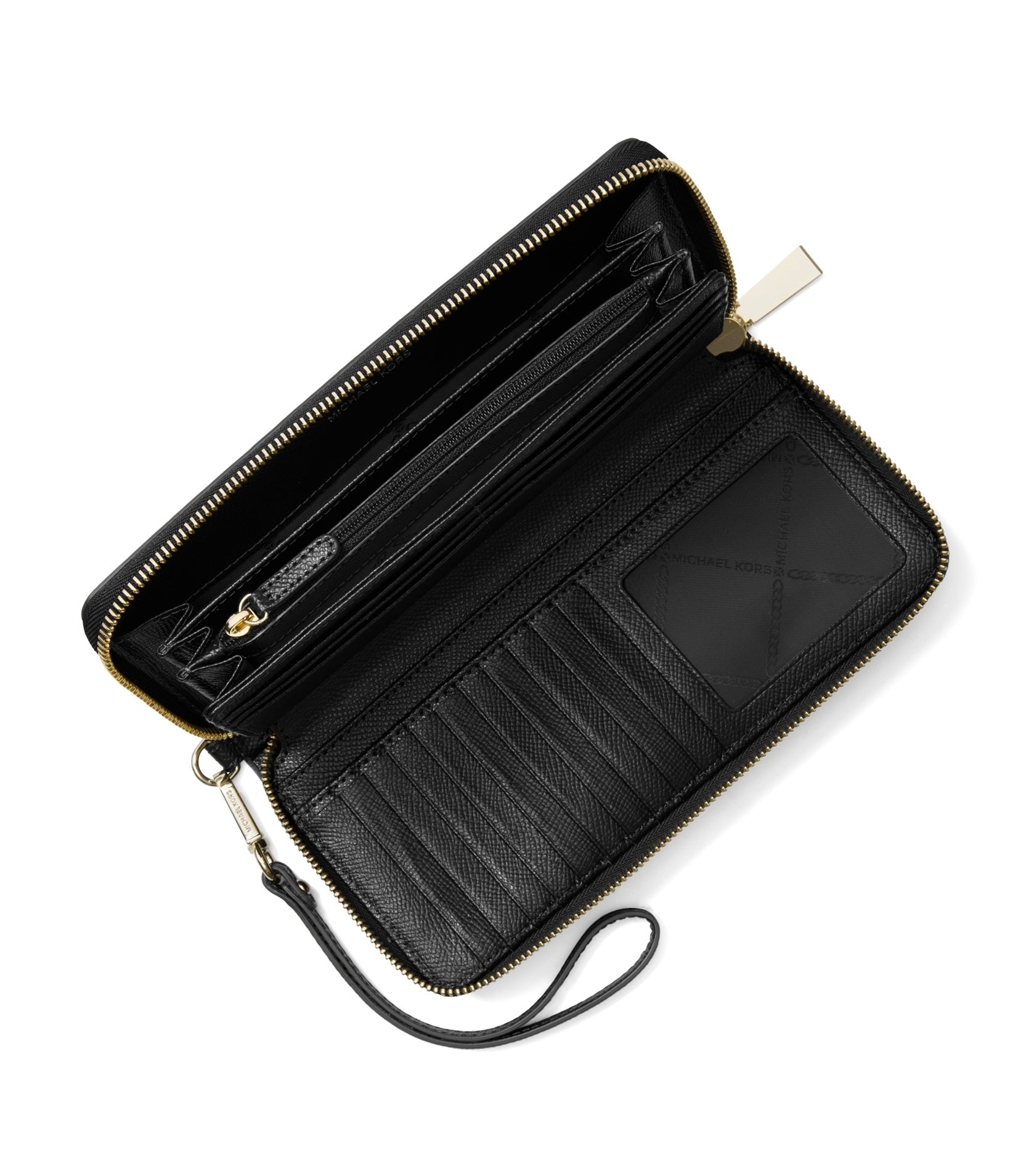 Crafted from rich details, clean lines and neat interior pockets, this wallet boasts a smart design with sophisticated look. Features textured leather construction, silver-tone hardware, top-zip closure, wrist strap with 7" drop, interior features lining, zip pocket, three accordion-style pockets, and ten card slots.Dimensions: 8-1/4" W x 4" H x 3/4" D