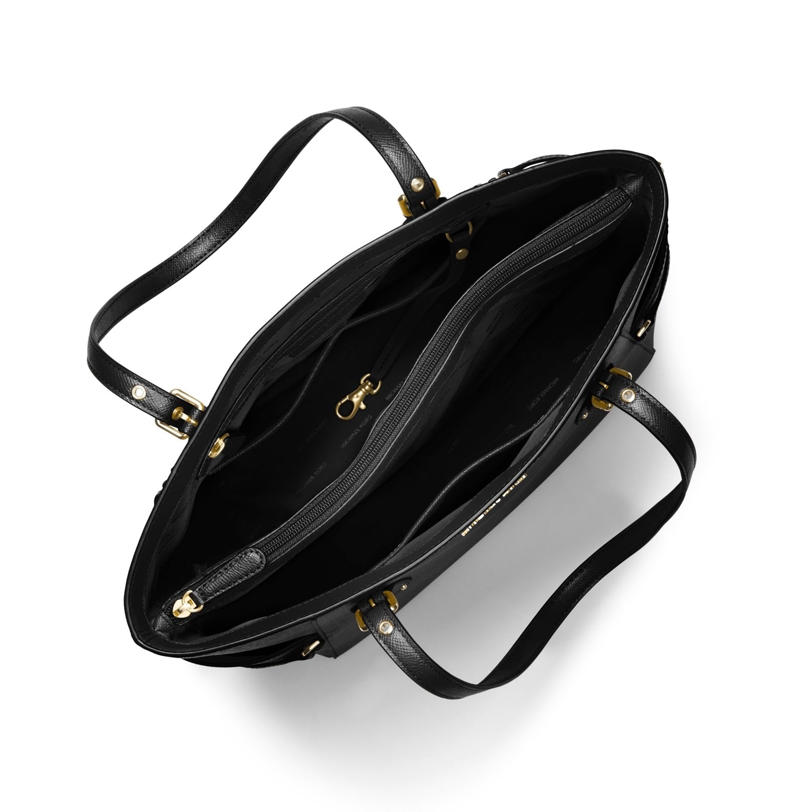 This Michael Kors bag can hold all of your essentials with a touch of stylish flare. Features crossgrain leather, 18k gold-tone hardware, two top carry handles, exterior slide pockets, two interior compartments and a zipped center divider.Dimensions: 14-3/4" W x 11" H x 6-1/4" D