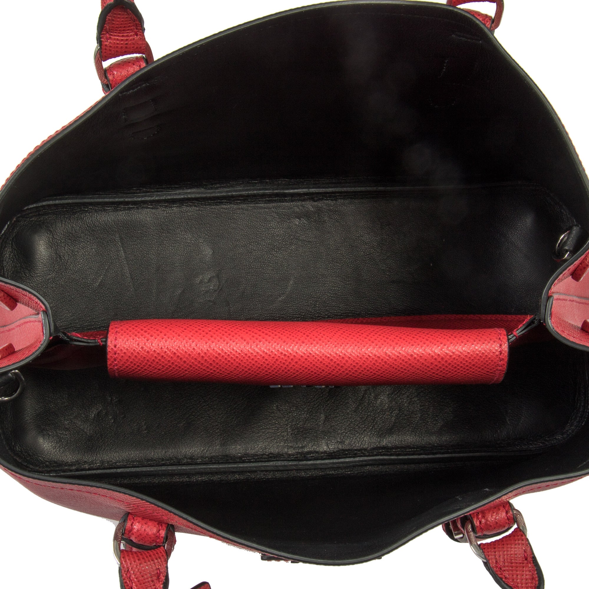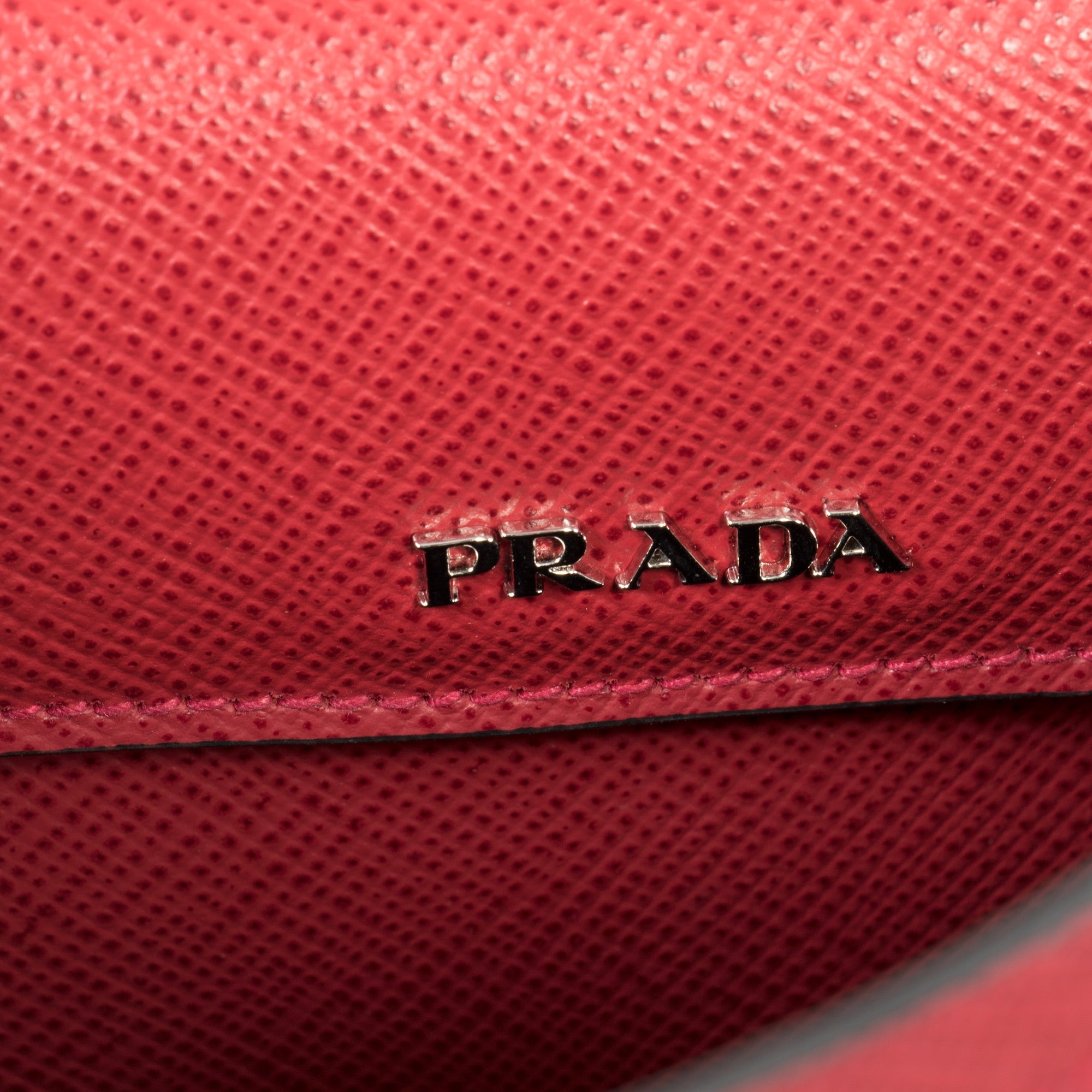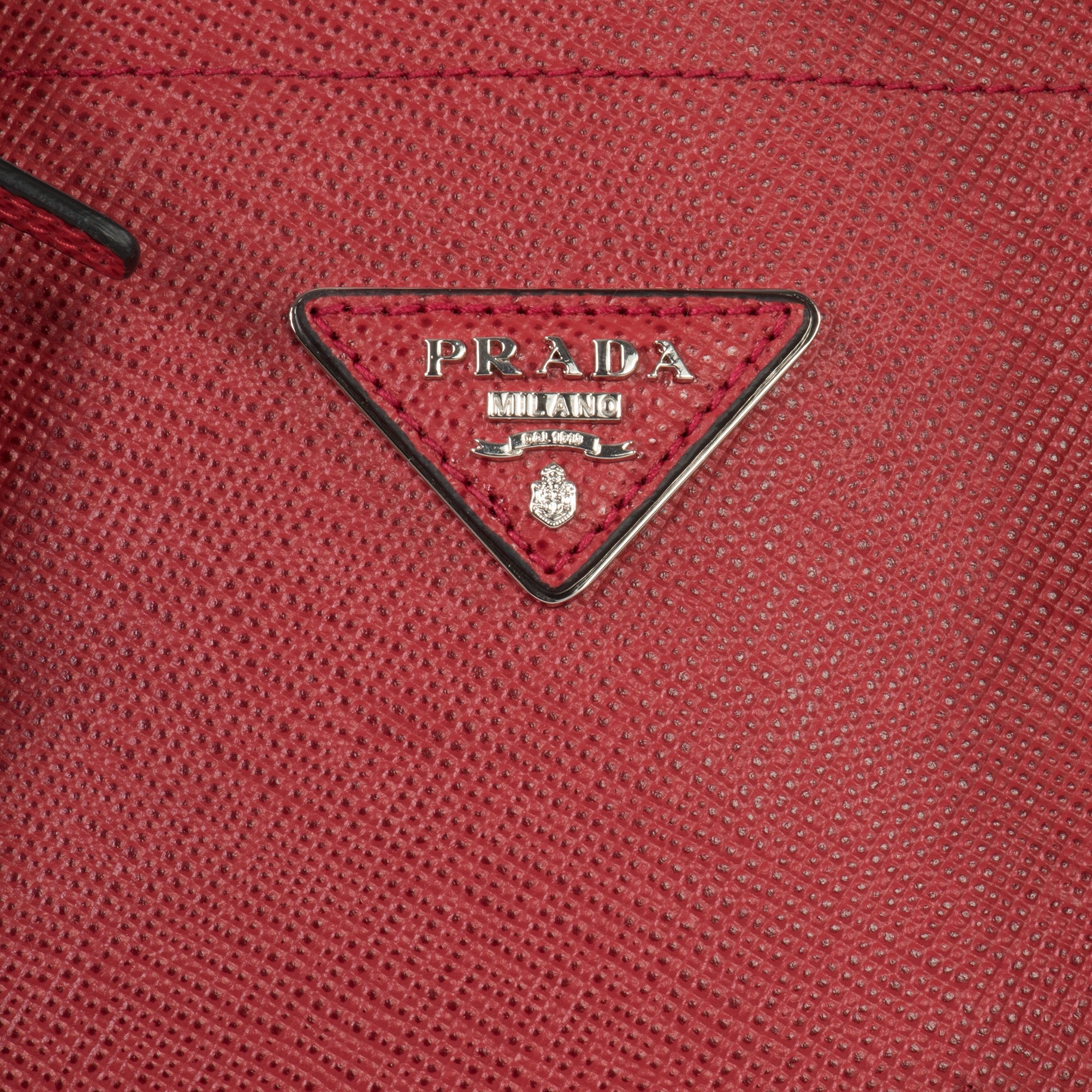 Elegantly constructed in Italy utilizing the finest materials and craftsmanship, this fuoco red Prada Double Tote Handbag Model 1BG883 F068Z is all class. The Saffiano Cuir leather tote is fashionably carried with a double leather handle and is also equipped with a detachable adjustable leather shoulder strap. Additional prominent features include distinctive silver tone hardware, metal branding on leather triangle and snap closures on sides. The plush two compartment interior features one flap pocket and lining.