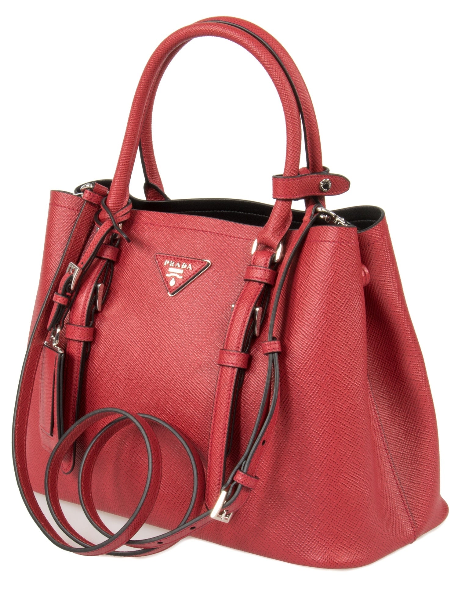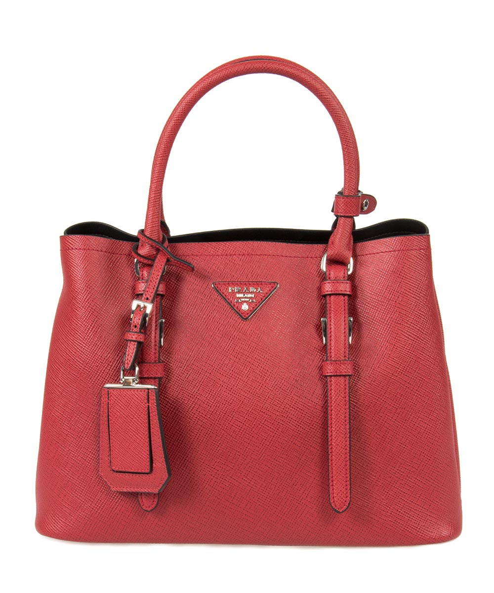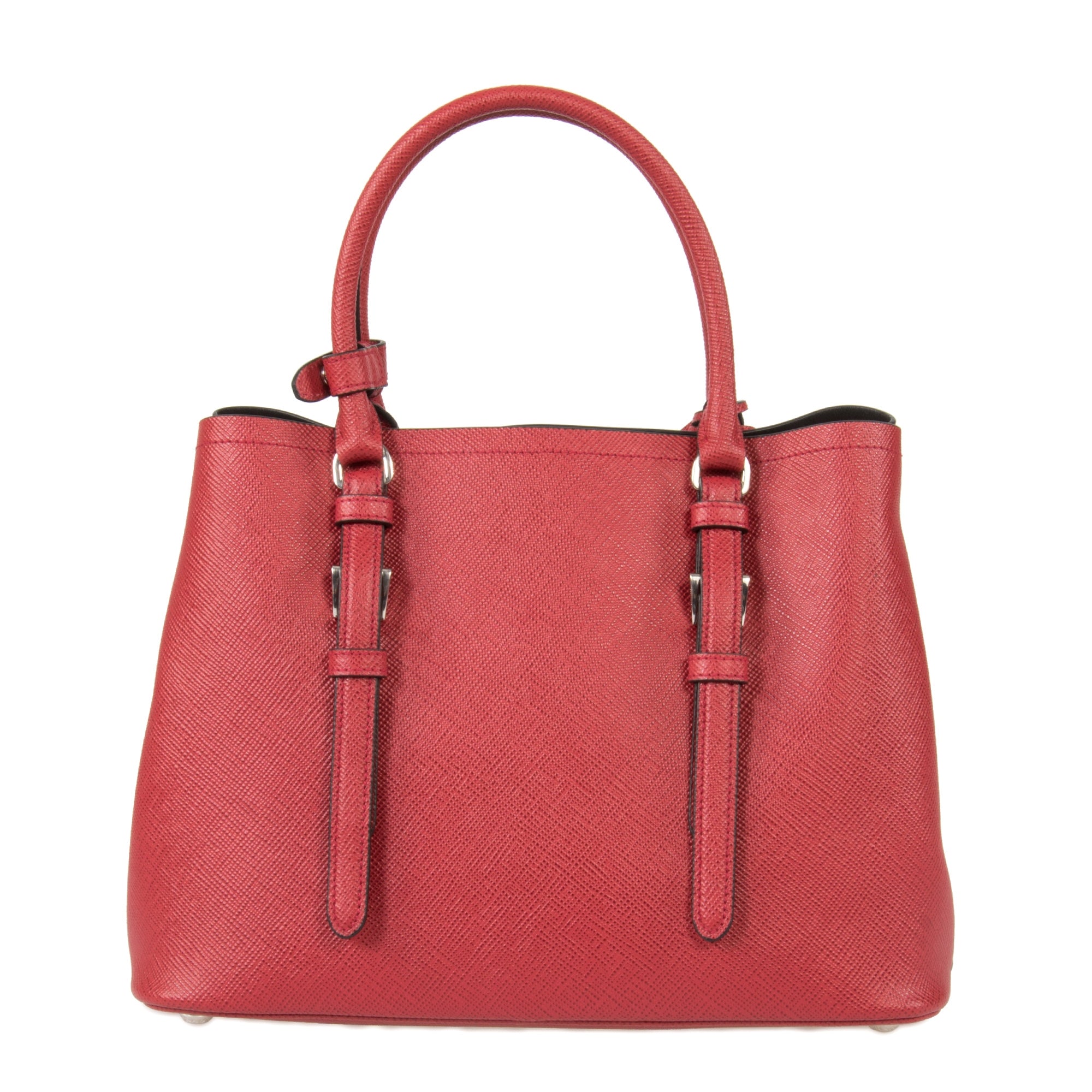 Elegantly constructed in Italy utilizing the finest materials and craftsmanship, this fuoco red Prada Double Tote Handbag Model 1BG883 F068Z is all class. The Saffiano Cuir leather tote is fashionably carried with a double leather handle and is also equipped with a detachable adjustable leather shoulder strap. Additional prominent features include distinctive silver tone hardware, metal branding on leather triangle and snap closures on sides. The plush two compartment interior features one flap pocket and lining.