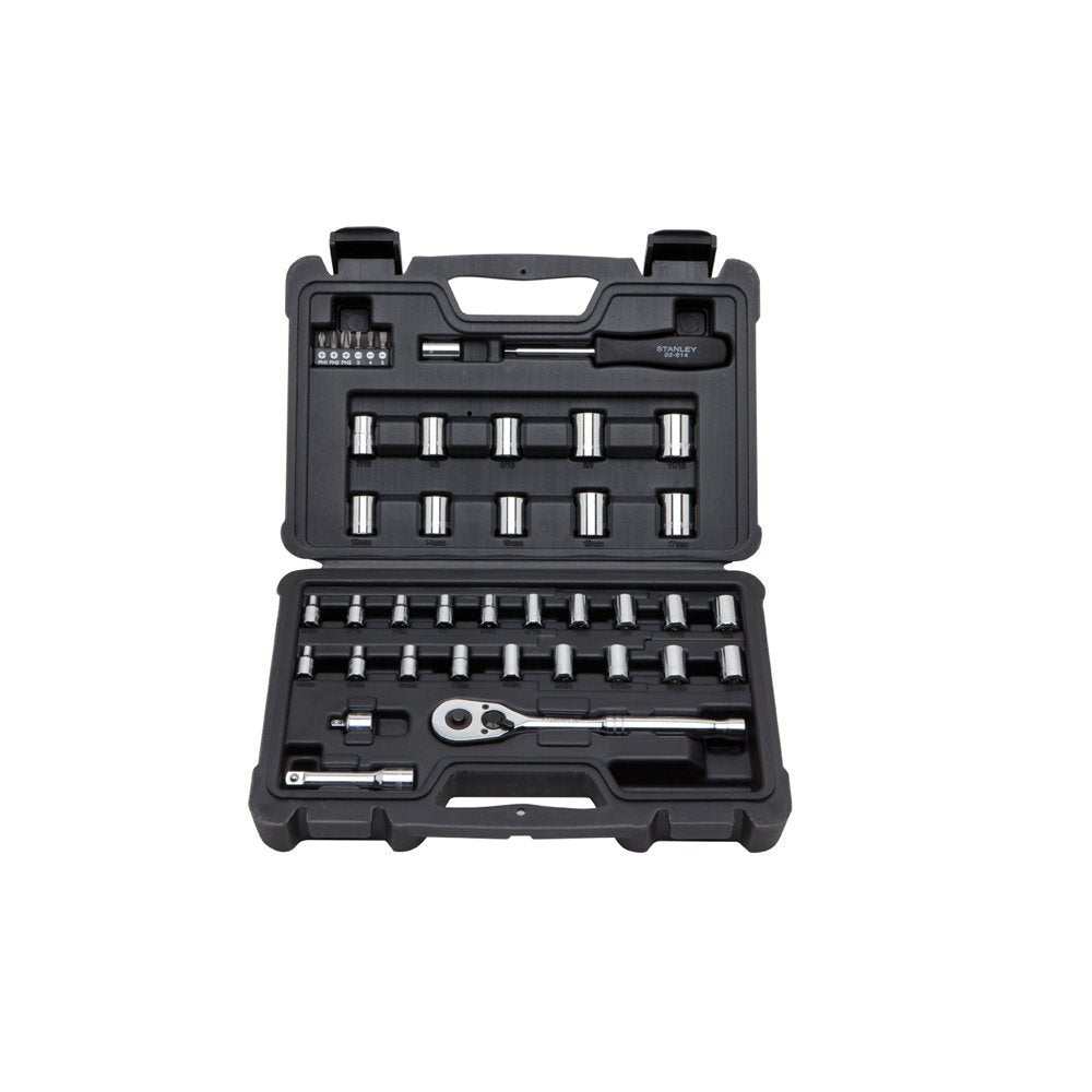 The STANLEY STMT71648 40pc Socket Set is constructed of high-alloy steel and heat-treated for performance. The Max-Drive design provides 15-percent more torque, and meets or exceeds ANSI standards for sockets and ratchets. Set contains: 15 1/4-inch sockets, 14 3/8-inch sockets, 1 3/8-inch pear head ratchet arm, 1 1/4-inch socket driver handle, 1 3/8- to 1/4-inch adapter, 1 3/8-inch extension bar, 1 1/4-inch drive specialty bit holder, 6 specialty bits, blow molded case