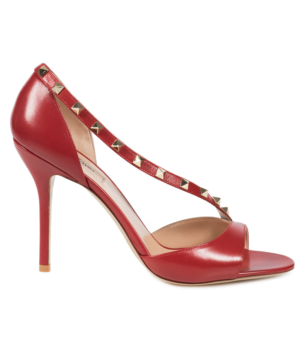 Valentino's trademark rockstuds have taken on another design with these d'Orsay peep toe pumps. More than a simple red leather pump, it's the chic detailing that makes these a classic Valentino creation. Curving around the stiletto is a wraparound strap in red leather with platinum-finish rockstud appliques. A pointed peep toe and slim 105mm heels make these pumps the perfect footwear for upcoming elegant events or a stylish day at the office. This luxurious pair ships with a branded Valentino box, dust bag, and designer's documentation. Made in Italy.