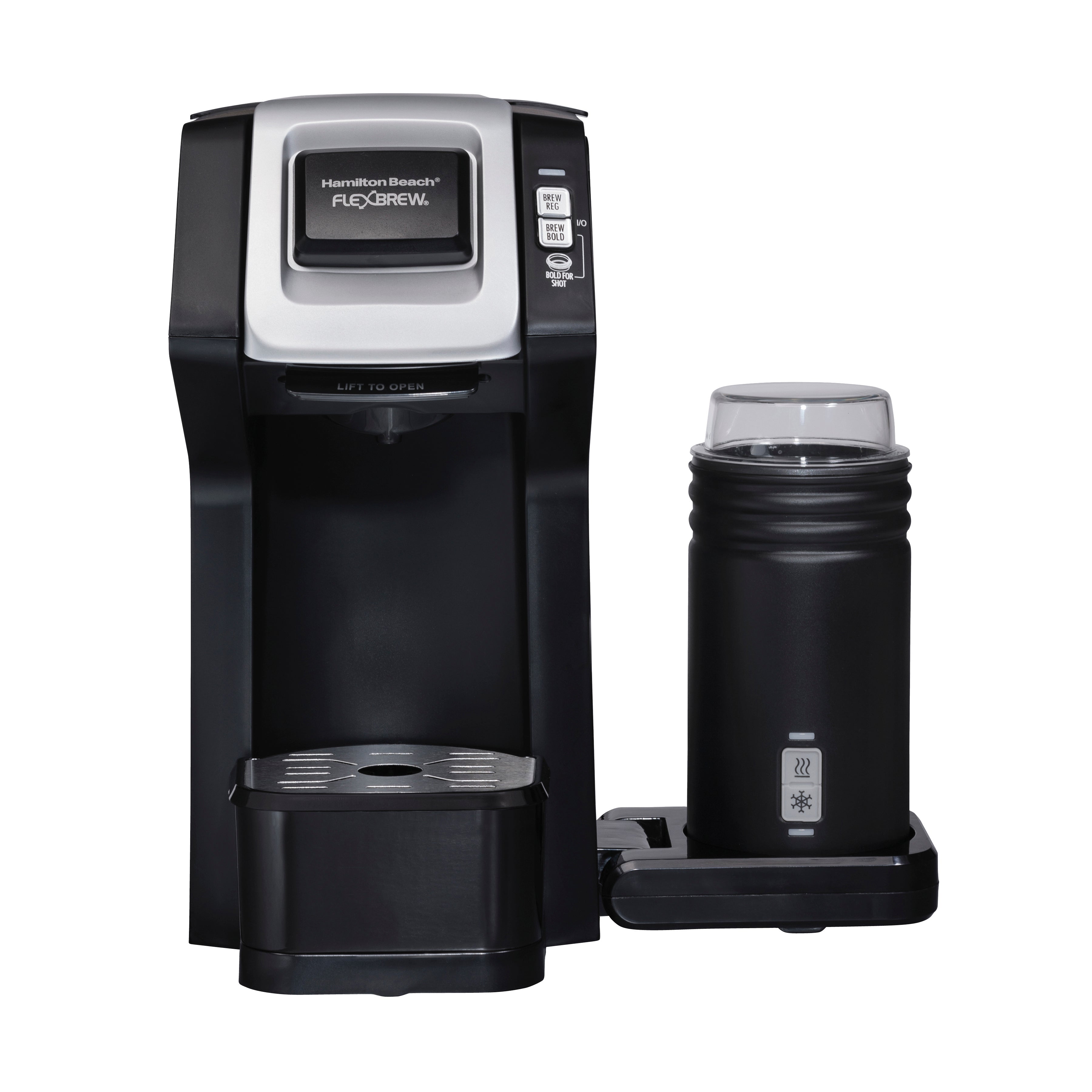 FlexBrew Dual Coffeemaker w/ FrotherElevate your at home coffee drink experience. Built-in milk frother makes creamy froth for lattes, cappuccinos and more. Brew with coffee pod brands or ground coffee. Frother creates hot frothy lattes in just 2 minutes. Frother only uses 3.5oz of milk. Use any type of milk like half and half, whole, cream, soy, almond, coconut and more. Frother lid doubles as a measurer for the perfect amount of water. Space saving design with frother base folding for compact storage. Fits travel mugs up to 7" tall.