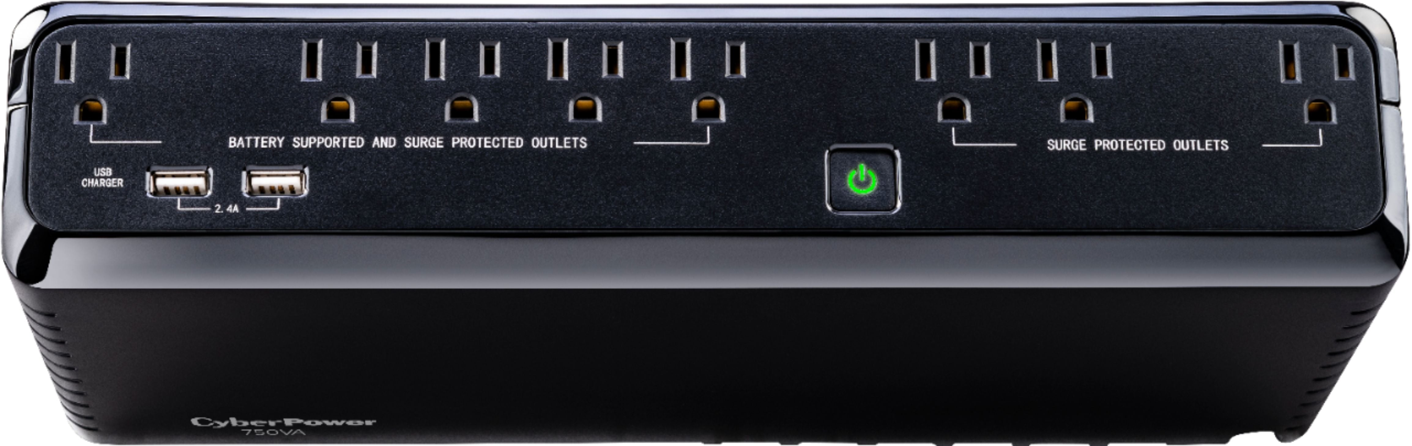 Protect electronics against power surges and prevent data loss with this slim profile 375W CyberPower UPS. The two USB Type-A ports charge portable devices rapidly while the compact charger lowers power consumption. Eight sizable outlets support transformer-based plugs for uninterrupted access. This ENERGY STAR-qualified CyberPower UPS includes free software for simple monitoring and control and keyhole slots support wall mounting to conserve space.