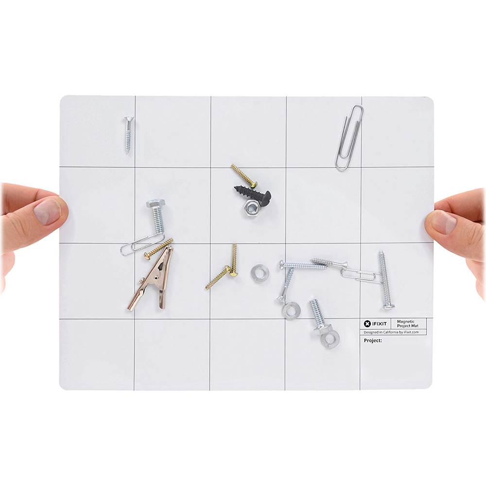 Keep repair tools and small parts organized while you work with this 8" x 10" iFixit magnetic project mat. It provides room to spread out supplies, and the magnetic surface instantly captures tiny metal pieces to prevent loss. This iFixit magnetic project mat comes with a Lumocolor correctable pen for writing directly on the mat.