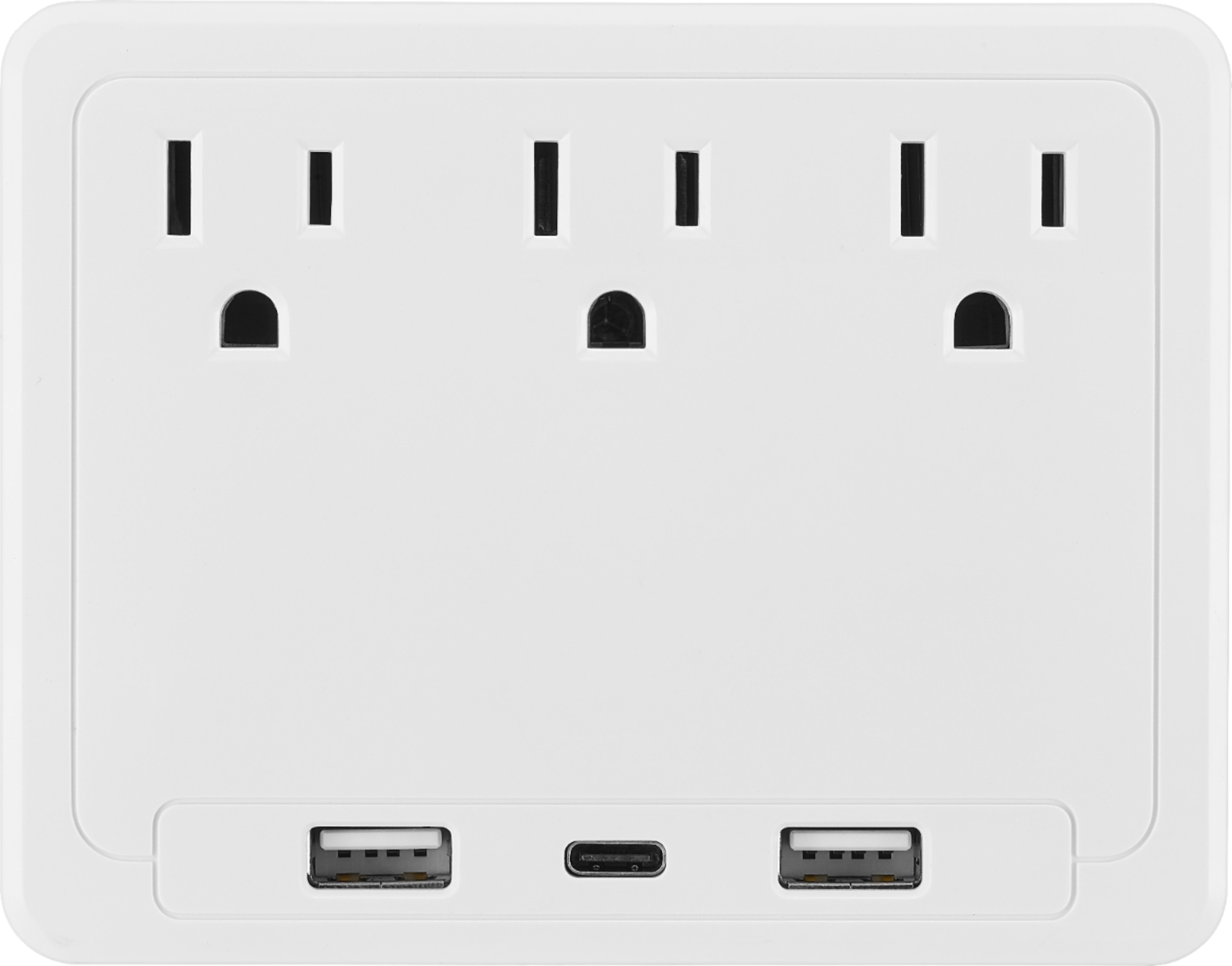 Keep your electronic gadgets safe from voltage spikes with this Insignia wall tap surge protector. The 600-joule surge rating protects your household electronics from voltage fluctuations and the three wide-spaced outlets provide sufficient room for large power adapters. This Insignia wall tap surge protector has two USB-A ports and a USB-C port to charge your mobile devices and a convenient space-saving design for easy placement.