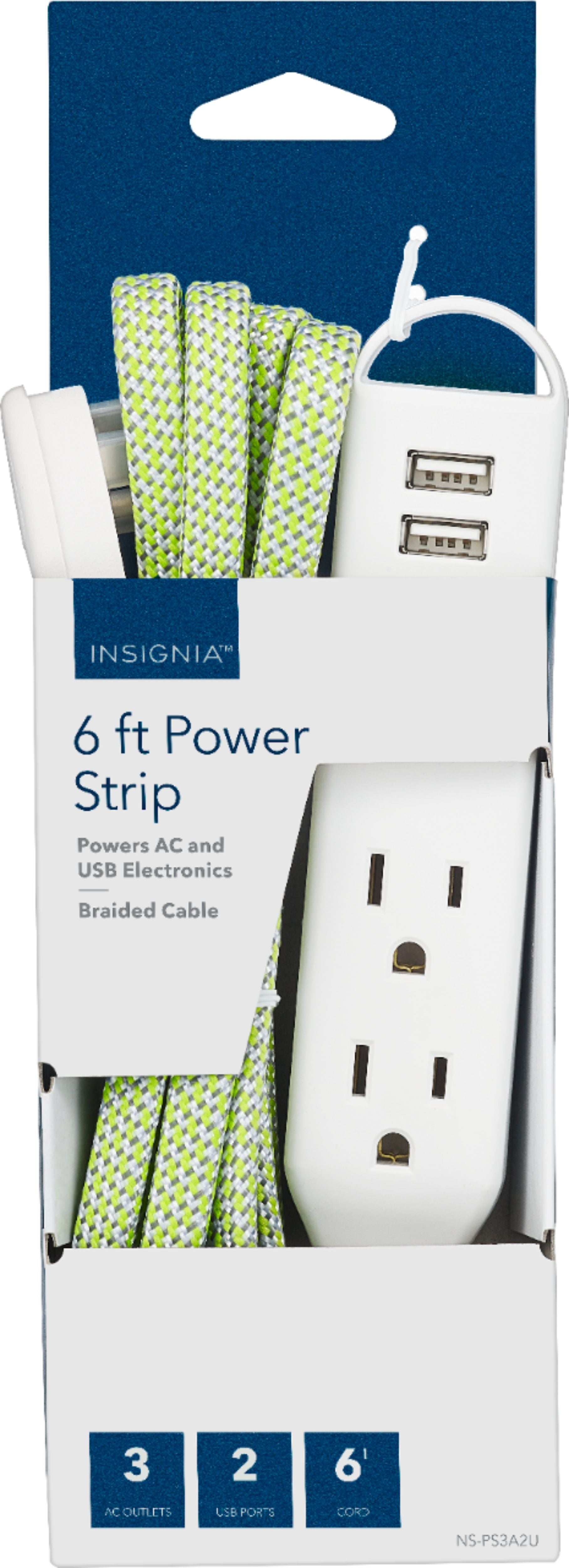 Energize your devices with this Insignia 6-foot power strip. The built-in outlets accommodate up to three devices at once, and the two USB ports let you charge smartphones and tablets quickly. This Insignia 6-foot power strip has a braided cord that reaches distant outlets and stands up to rough treatment.