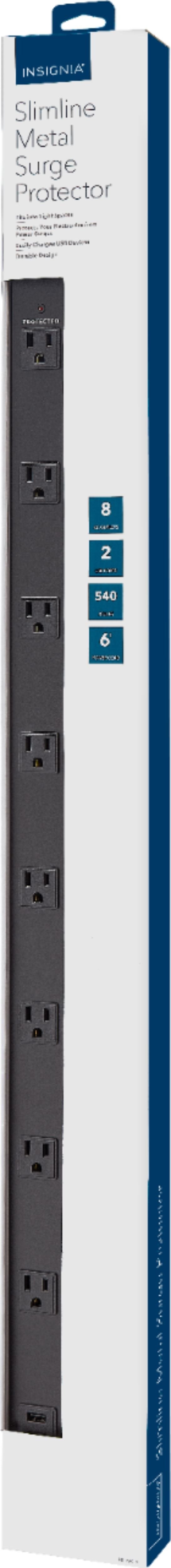 Protect your electronics with this Insignia eight-outlet surge protector. The outlets are spaced far apart to accommodate large plugs and two USB ports let you charge your cell phone and other compatible devices at the same time. This Insignia eight-outlet surge protector has a slim metal housing that fits easily into tight spaces.