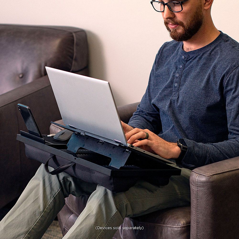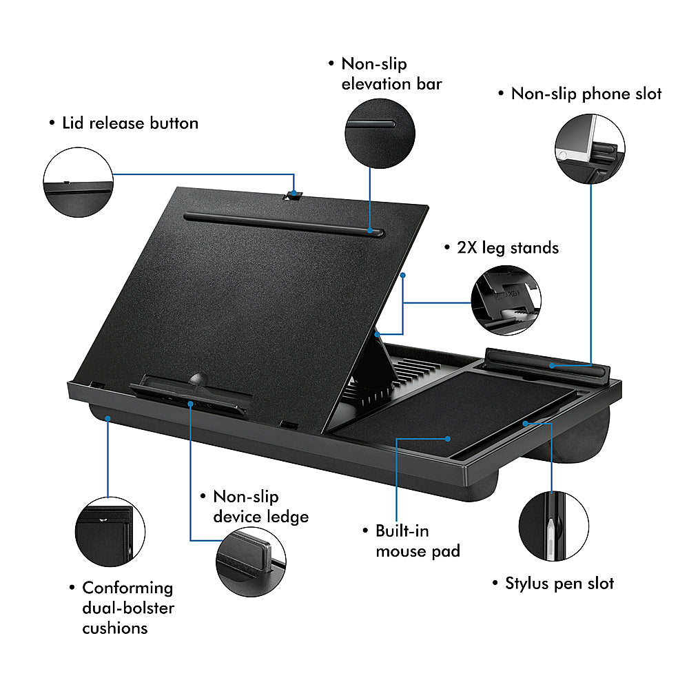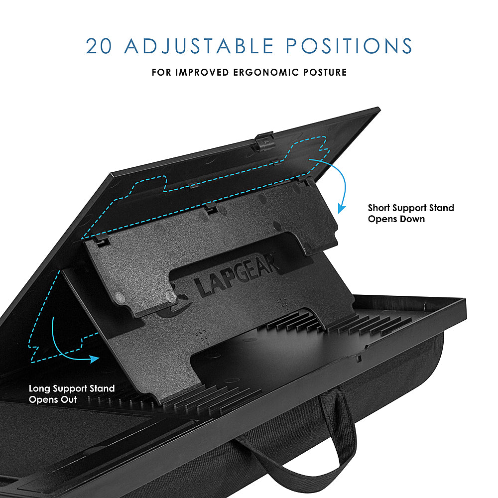 This LapGear Ergo Pro Lap Desk takes ergonomics to the next level, with 20 adjustament positions designed to help reduce neck strain and other pains associated with poor work posture. This lap desk includes a built-in mouse pad and stylus slot to allow your tools to sit securely while you switch back and forth between your touch-screen tablet and 15-Inch laptop. Never lose sight of your phone while you work, by placing it in the phone slot with added grip support for improved sturdiness.
